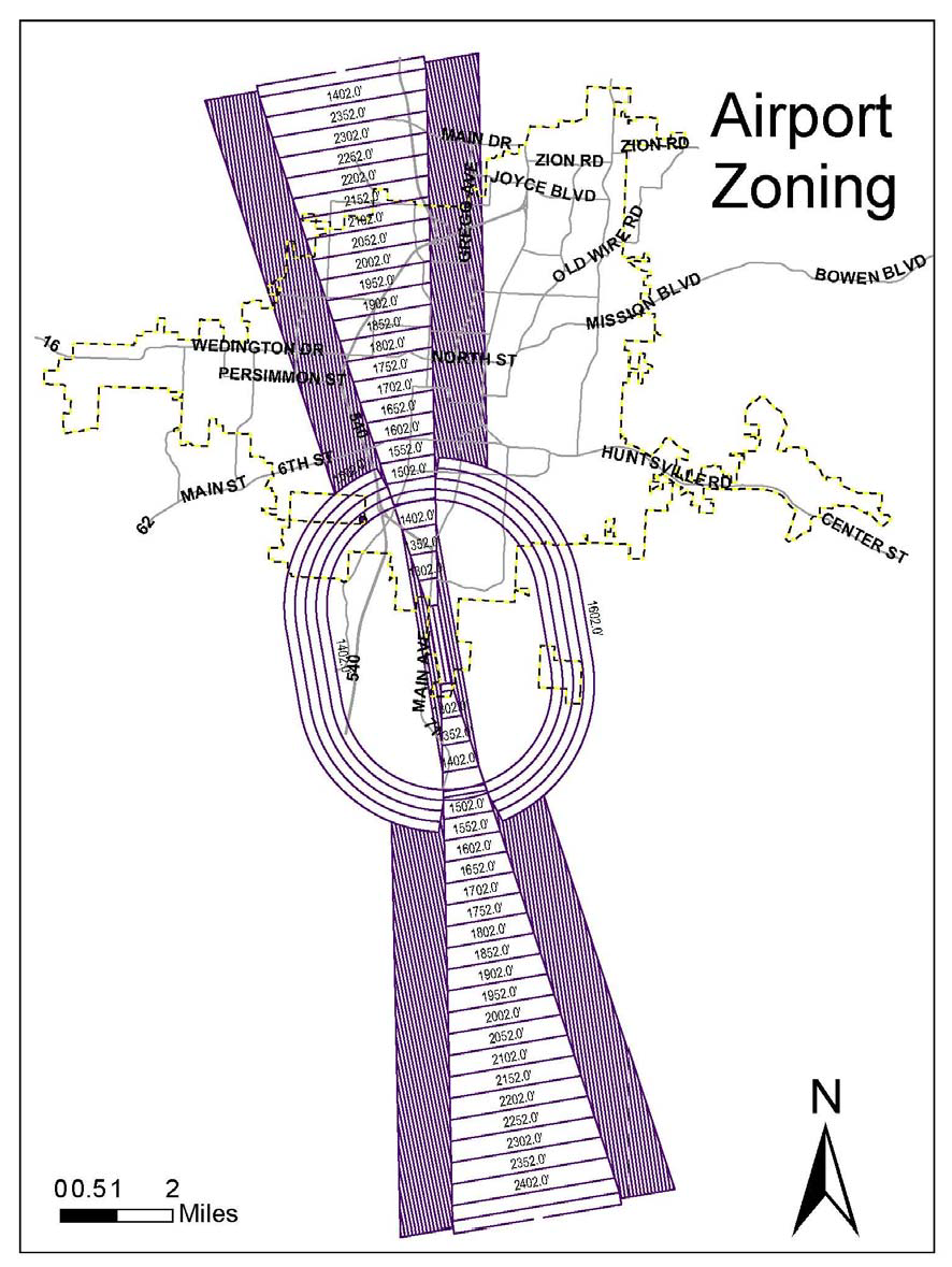 There are hereby created and established zones, which zones include all the land lying beneath the approach surfaces, transitional surfaces, horizontal surfaces, and conical surfaces as they apply to the municipal airport. Said zones are shown on the airport zoning map consisting of one sheet, which shall be made a part hereof by reference. An area located in more than one of the following zones is considered to be only in the zone with the more restrictive height limitation. The various zones are hereby established and defined as follows: