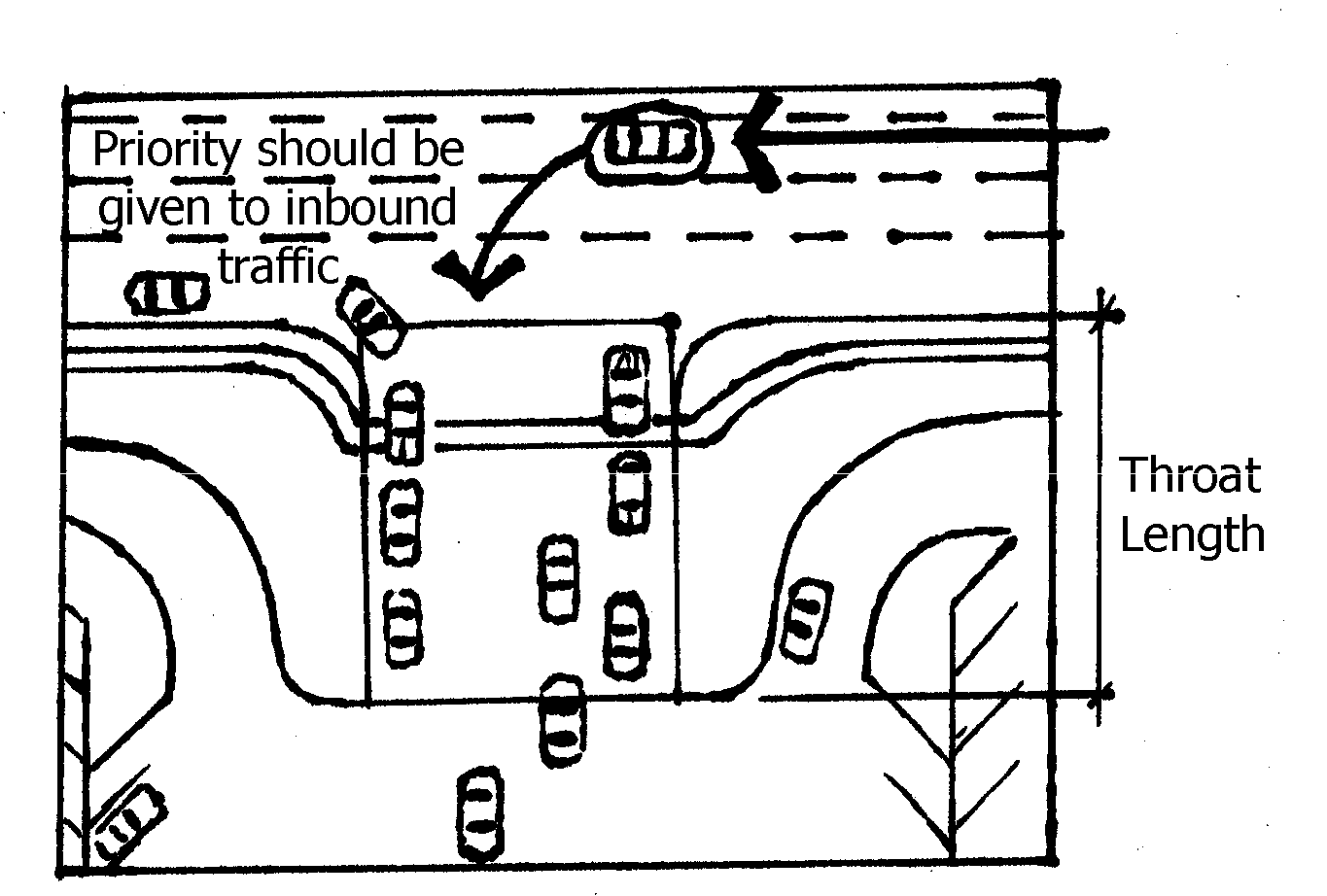 Commentary: The throat lengths in Table 2 are provided to assure adequate stacking space within parking lot driveways for general land use intensities. This helps prevent vehicles from stacking into the thoroughfare as they attempt to enter the parking lot. High traffic generators, such as large shopping plazas, need much greater throat length than smaller developments or those with unsignalized driveways. The guidelines here for larger developments refer to the primary access drive. Reduced throat lengths may be permitted for secondary access drives serving large developments.