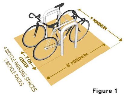 Spacing Between Bicycle Racks. Each bicycle parking space shall have 36 inches of clear space, paved or unpaved, beside the rack allowing each rack to support two (2) bicycles. The 36-inch dimension may overlap another bicycle parking space such that racks positioned in a parallel row may be 36 inches on center. The minimum length dimension required is 8 feet free and clear (See: Figure 1).