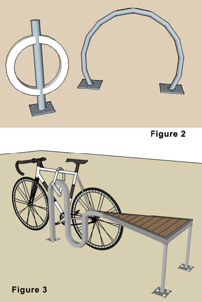 Bicycle Rack Specifications. The Planning Division has pre-approved the standard inverted u-shaped bicycle rack (see figure 1). Applicants may also request an alternative design with Planning Division approval (see examples in figure 2). All bicycle racks shall be designed so that they support a bicycle at two points on the bicycle frame and such that the bicycle may be securely locked with a u-shaped bicycle lock (See figure 3).