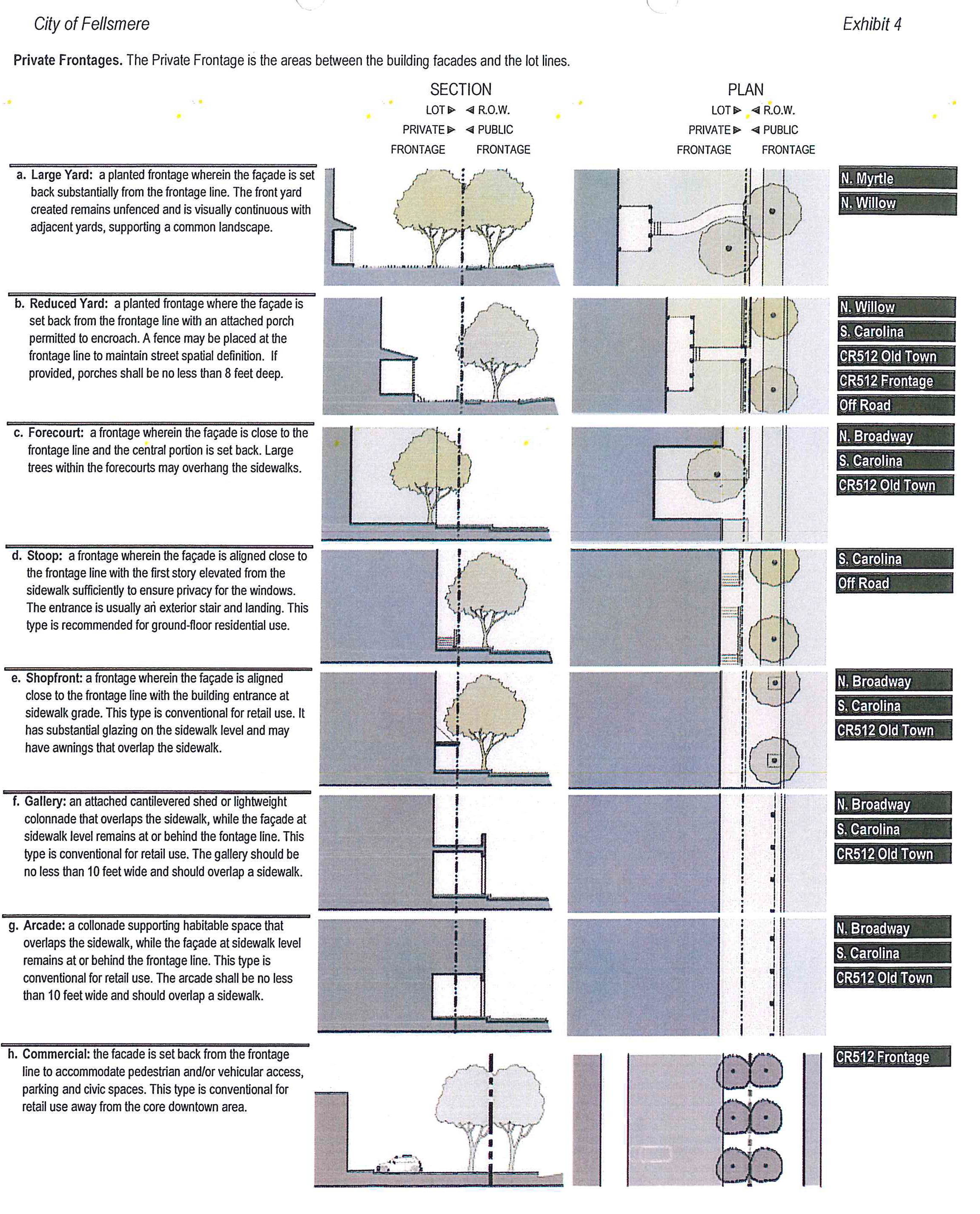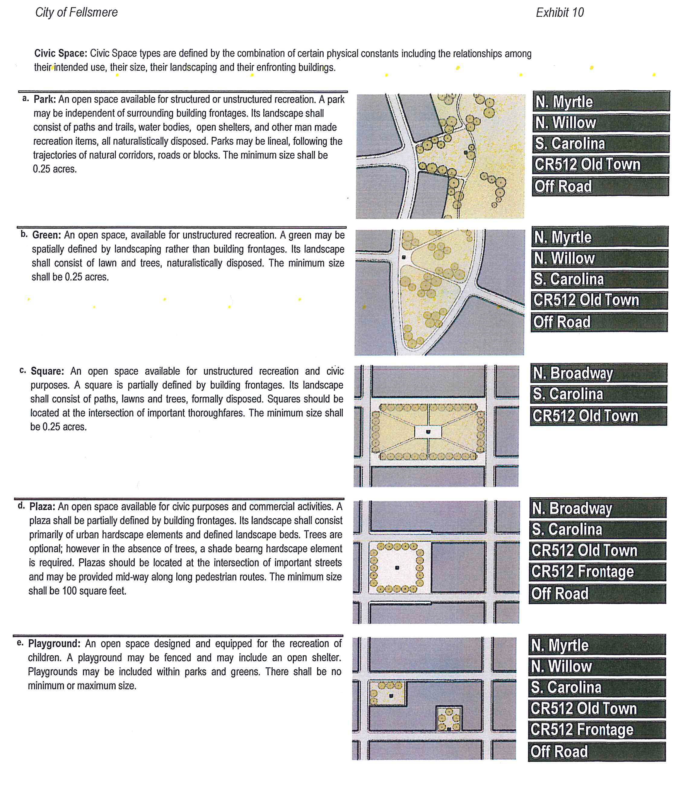 The civic space shall include within the front yard, or within the N. Willow right-of-way by minor relief, as determined by the city as part of the site plan approval, a minimum of 100 square feet plaza as defined in exhibit 10.