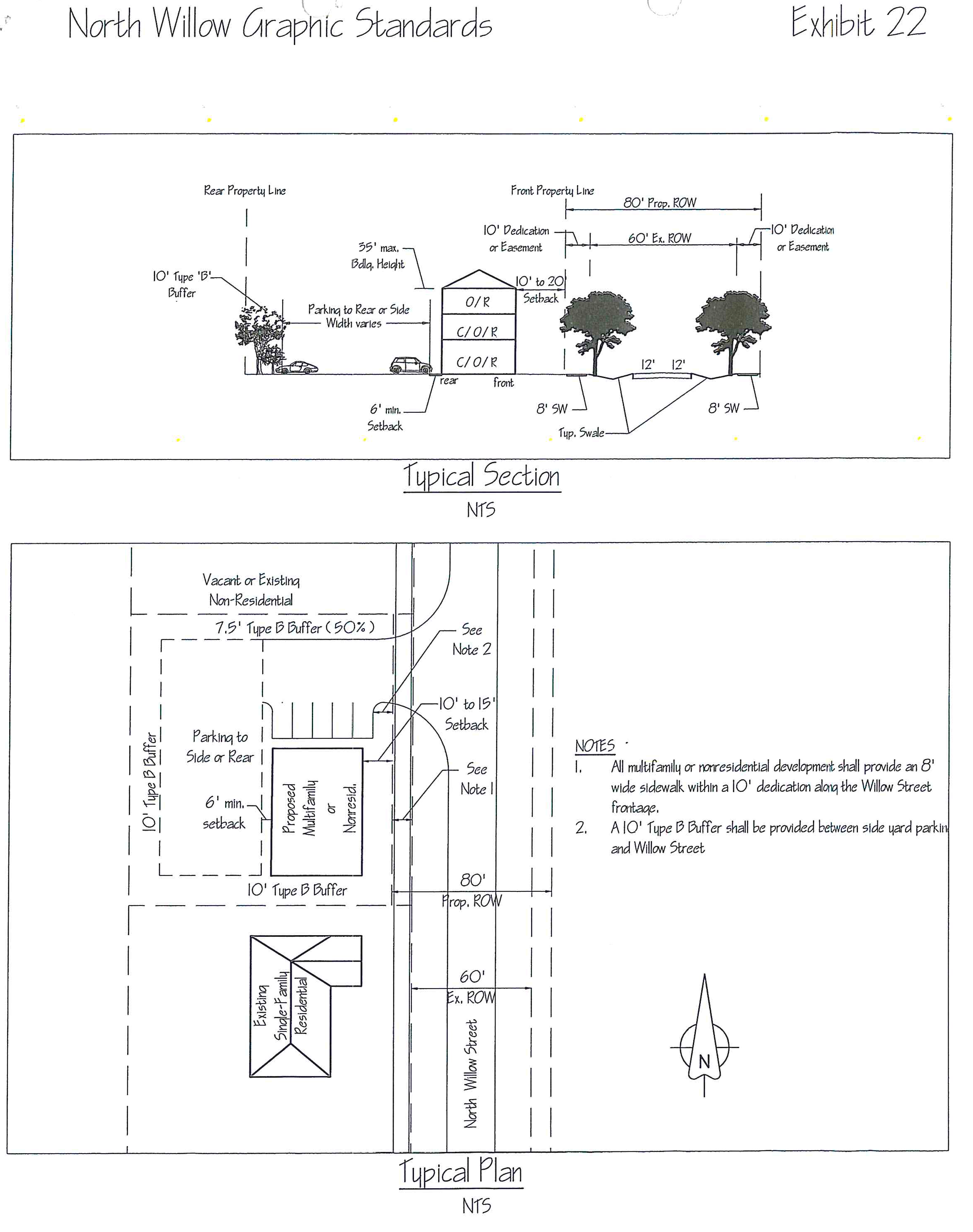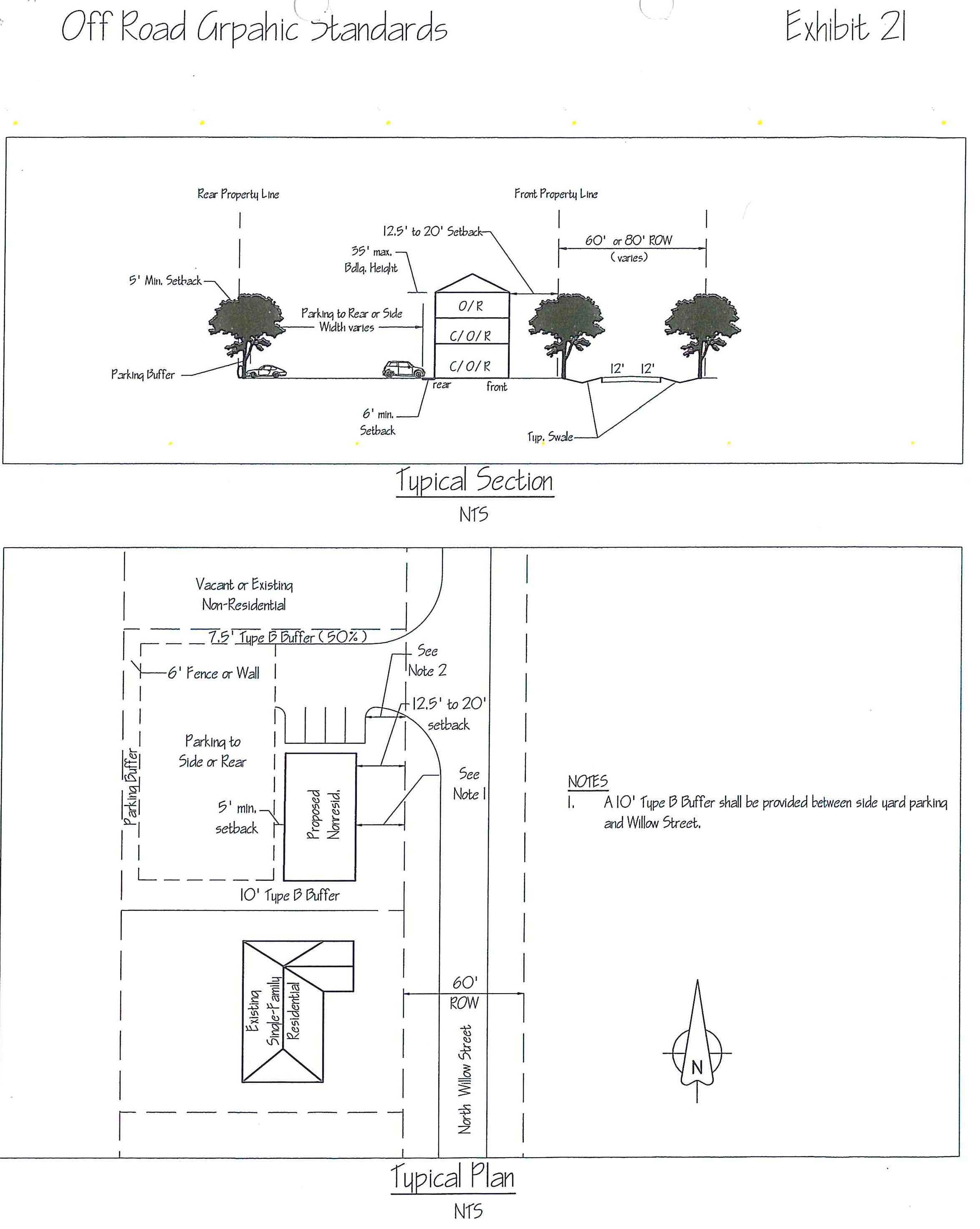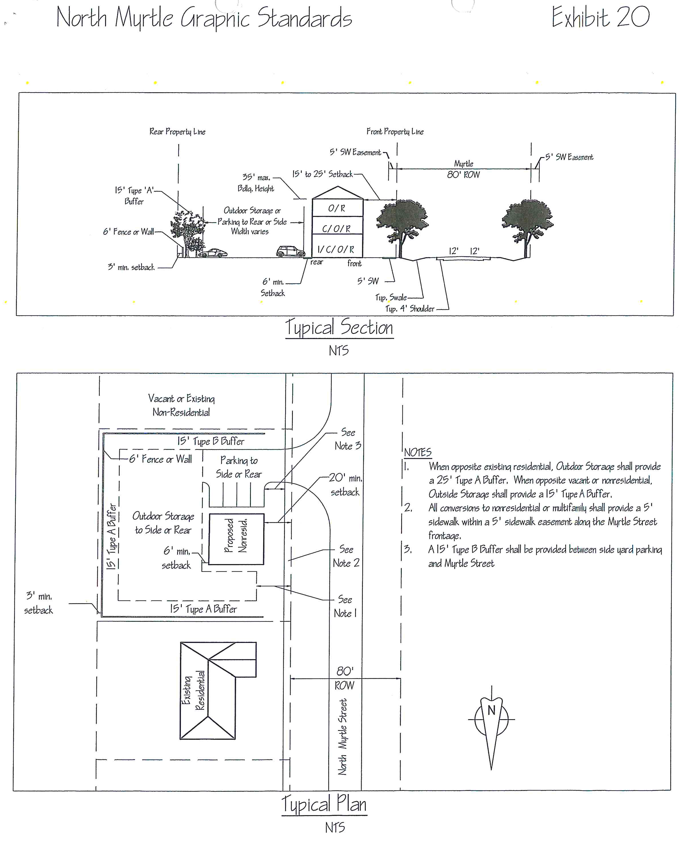 For nonresidential or multifamily developments, a 15-foot wide type B buffer shall be provided between N. Myrtle right-of-way and any side yard parking.