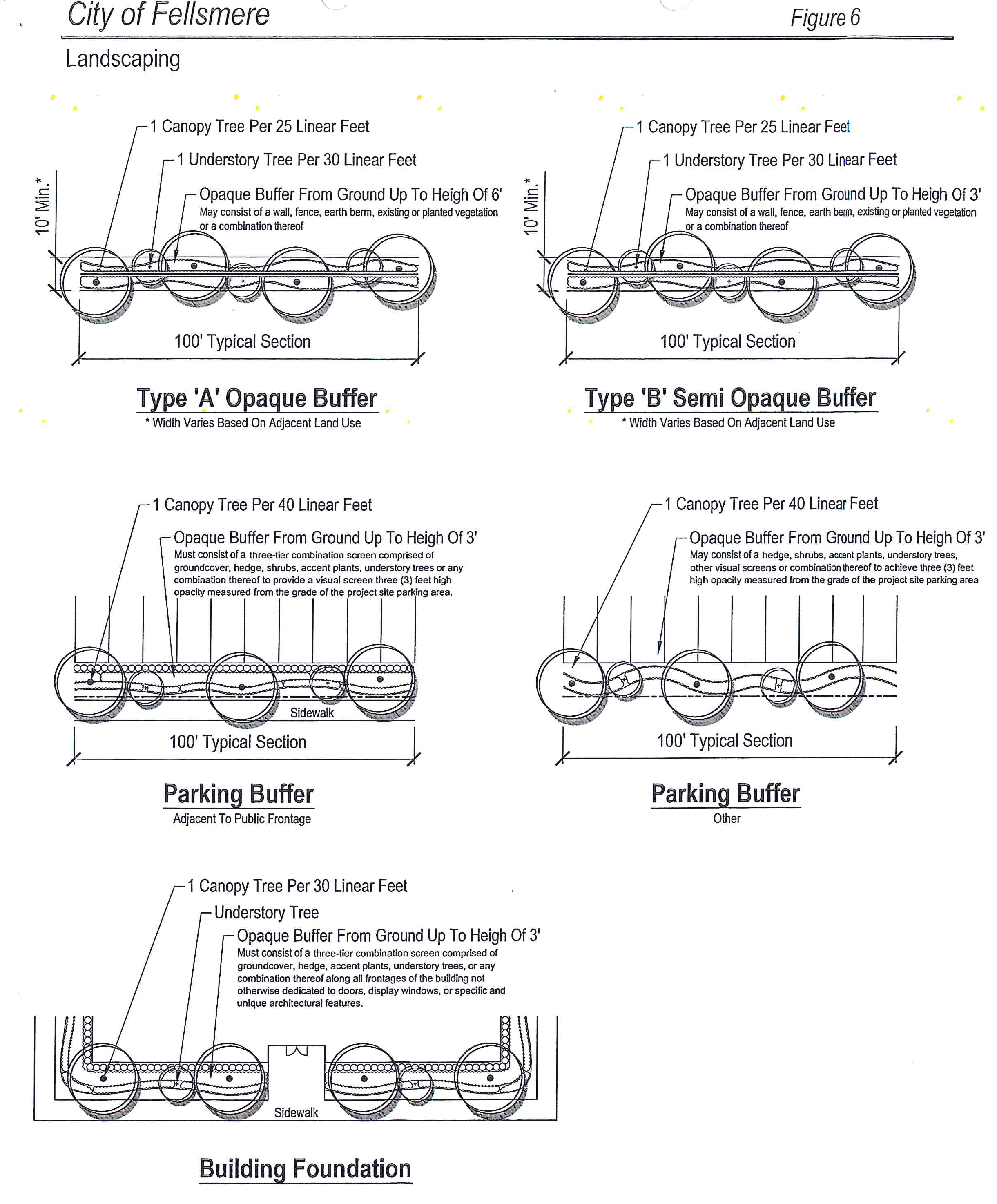 Building foundations shall be landscaped with at least one tree credit for every 30 feet of building foundation and a three-tier combination screen comprised of groundcover, hedge, and shrubs, accent plants or understory trees along all frontages of the building not otherwise dedicated to doors, display windows, or specific and unique architectural features. Sod and nonliving groundcover shall not be credited toward this requirement. Trees required for front or side yards may be credited toward this requirement if located in a unified landscape design theme as minor relief. Building foundations adjacent to parking perimeters are not required to provide parking perimeter landscaping.