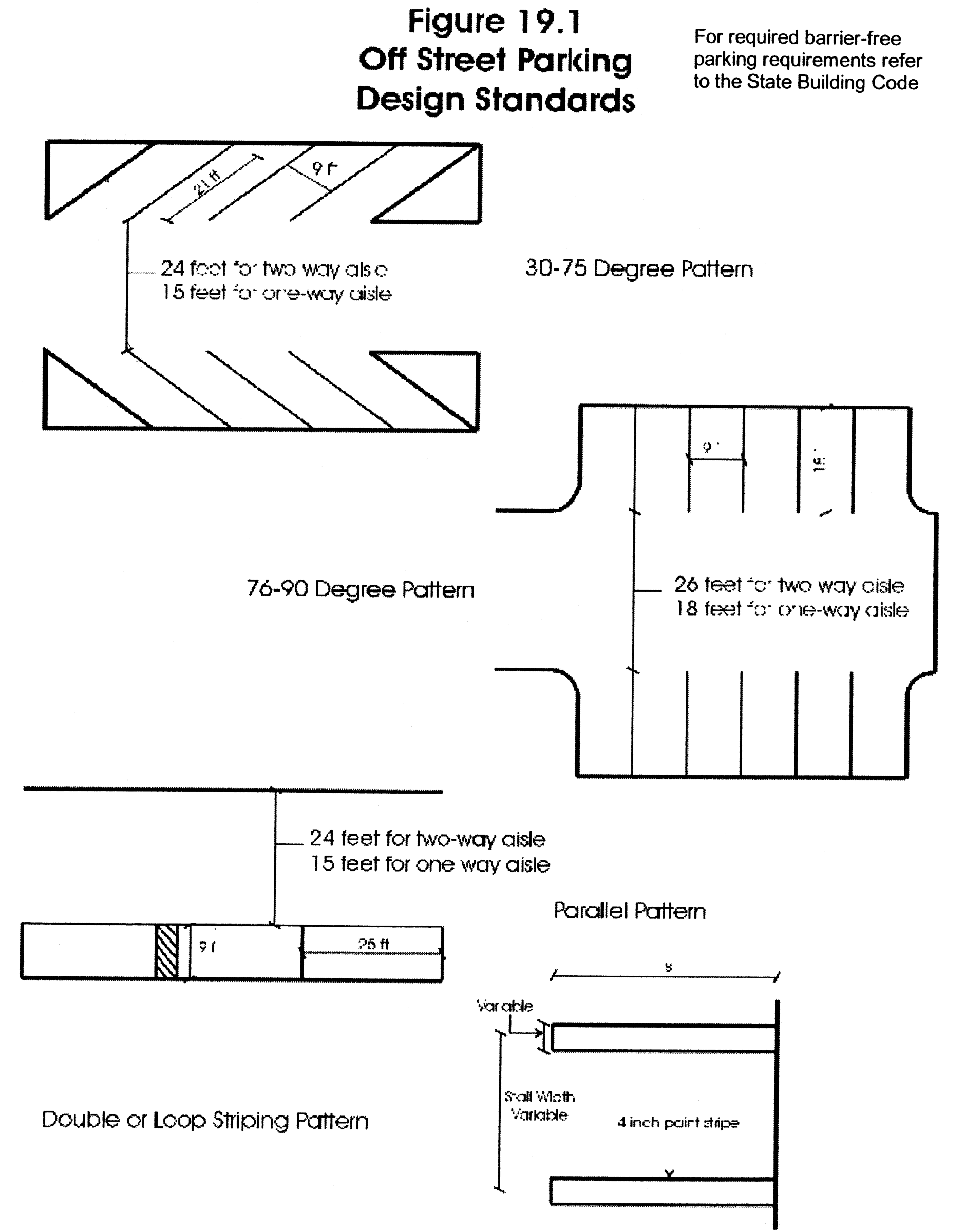 Parking lot marking. All parking spaces must be marked with double (or loop) stripes three to four inches wide and spaced not less than 18 inches apart and no greater than 24 inches apart (see Figure 19.1 Off-Street Parking Design Standards).