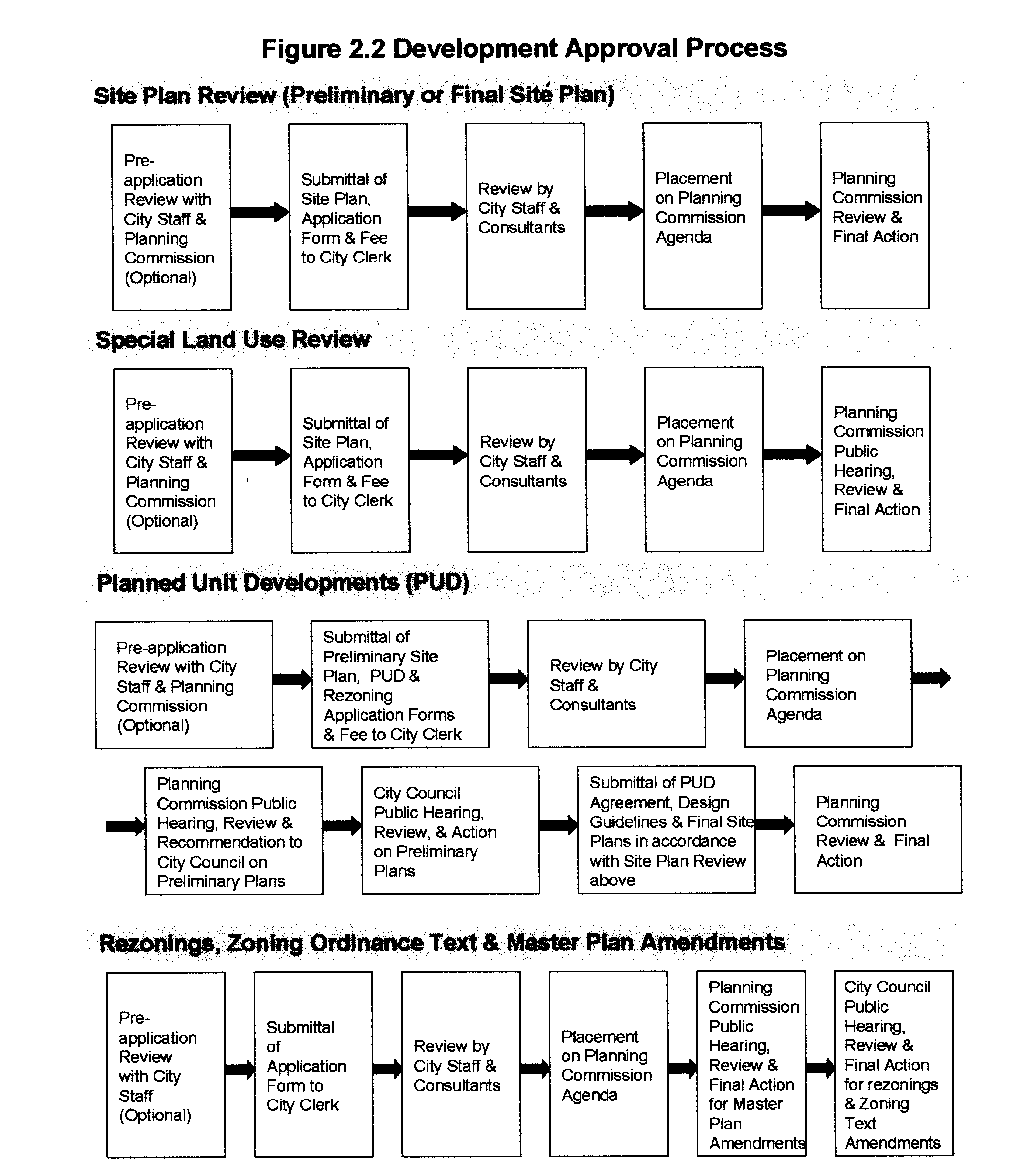 The process for application and review by the city for site plan review, special land use approvals, planned unit developments (PUDs), condominium developments, text amendments to this chapter, and rezonings of land is shown on Figure 2.2, Development Approval Process. Submittal dates, application forms, and information on fee requirements are available at the city clerk's office.