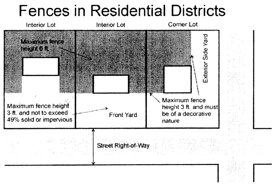 Unless specifically authorized elsewhere in this chapter, fences or walls located within the required front yard or exterior side yard shall not exceed three feet in height, be in excess of 49 percent solid or impervious, and shall be of a decorative nature as determined by the building official/zoning administrator.
