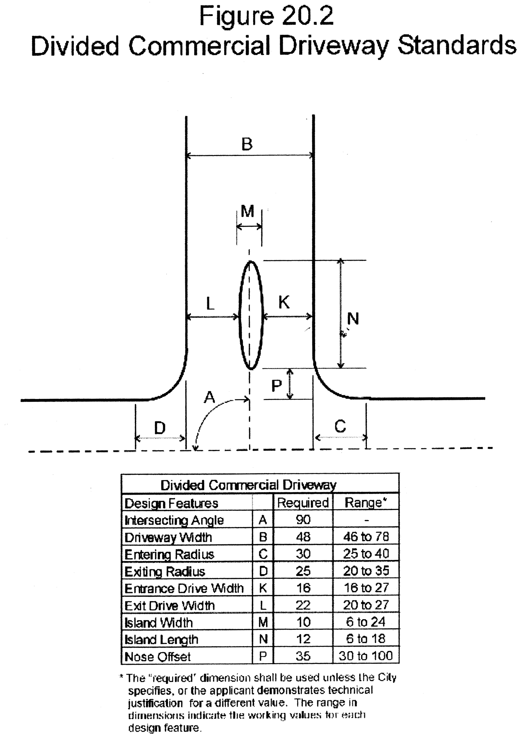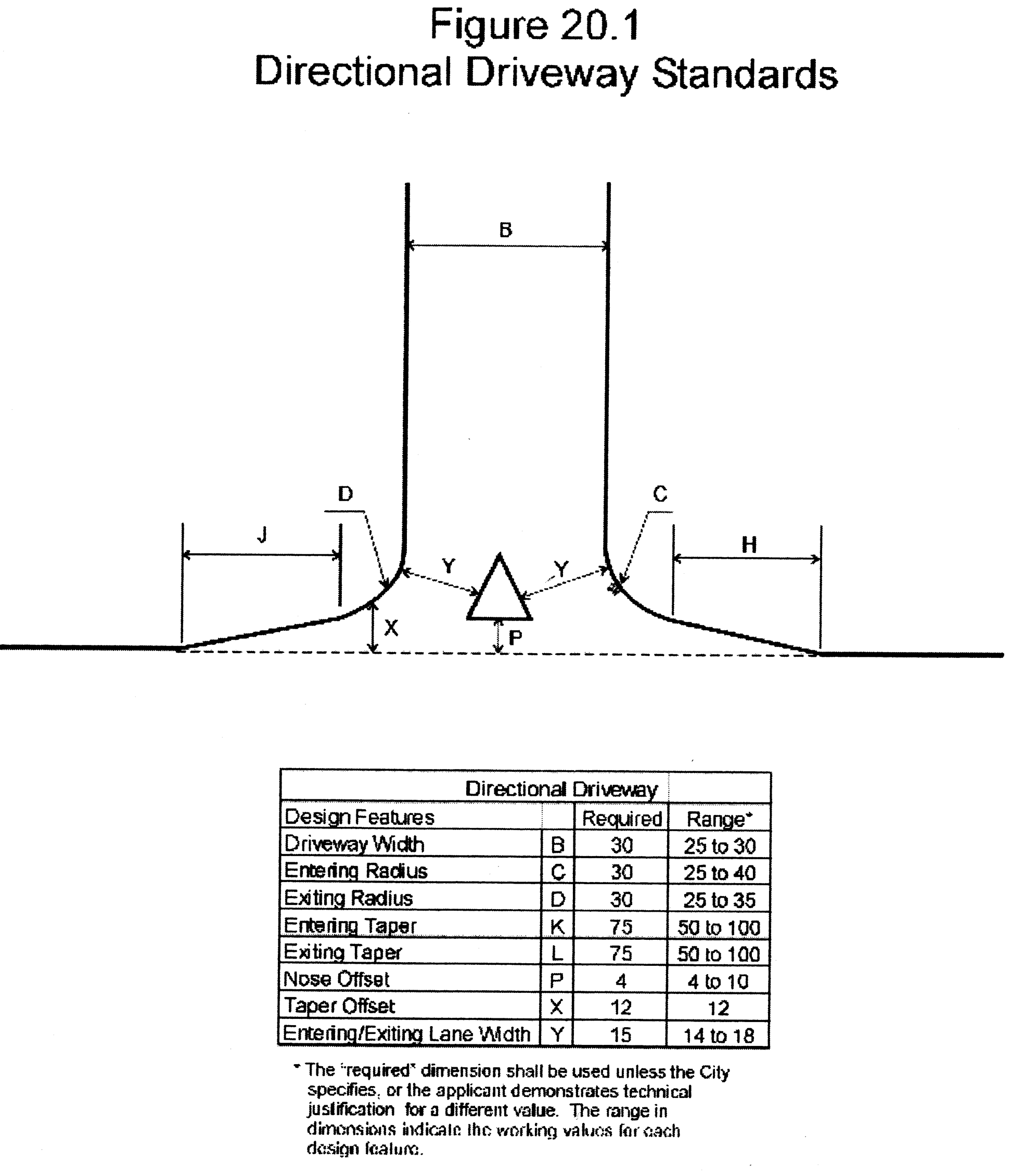Directional driveways, divided driveways, and deceleration tapers and/or by-pass lanes. Directional driveways, divided driveways, and deceleration tapers and/or by-pass lanes may be required by the planning commission where they are necessary to reduce congestion and accident potential for vehicles accessing the proposed use or site. Right-turn tapers shall be a minimum of 75 feet in length and at least 11 feet wide. Design of direction and divided driveways shall be in accordance with the designs in Figures 20.1 Directional Driveway Standards and 20.2 Divided Commercial Driveway Standards.