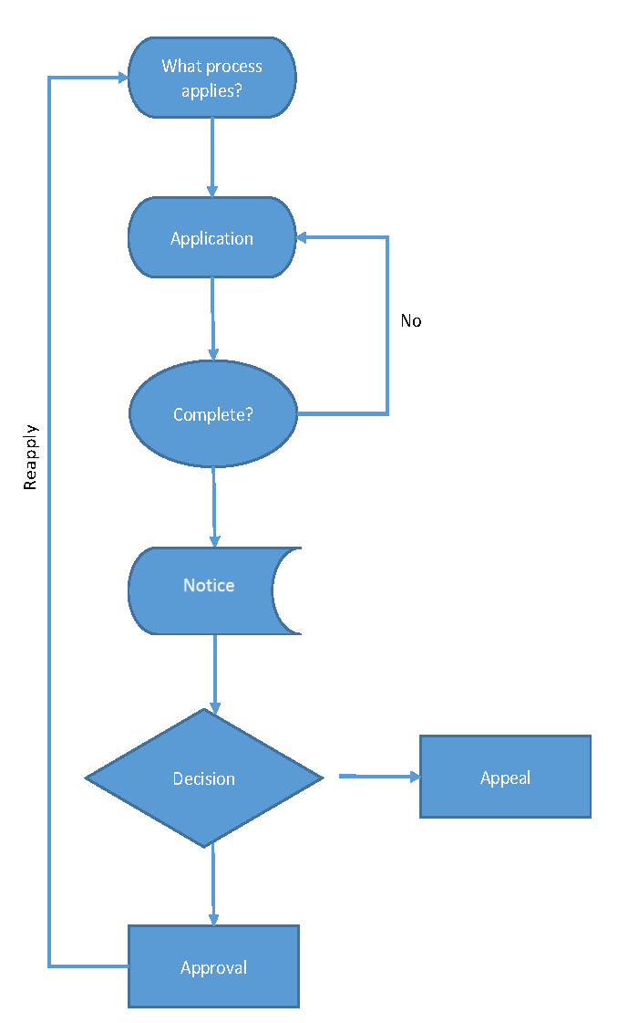 Process elements. This chapter sets up rules for procedures, such as pre-application, neighborhood notification, notices and public hearings. It then describes the process for specific land use decisions. The procedures have a common workflow and description, as follows: