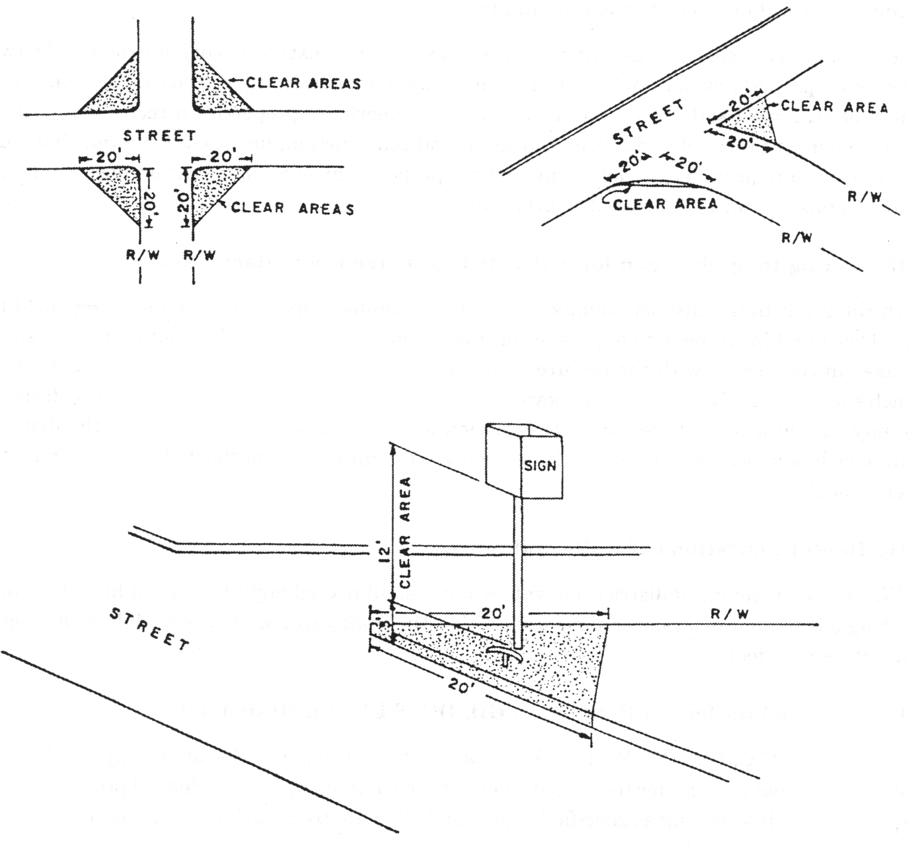 On corner lots within all zoning districts, except the D-C zoning district, no fence, shrubbery or other obstruction to the traffic sight vision, except utility poles or light or sign standards, shall exceed a height of three (3) feet within a triangular area formed by the intersection of the right-of-way lines of two (2) streets or a street intersection with a railroad right-of-way line, and a diagonal line which intersects the right-of-way lines at two (2) points, each twenty (20) feet distance from the intersection of the right-of-way lines, or, in the case of a rounded corner, from the point of intersection of their tangents; provided, however, signs, lights, or similar objects which are totally located at least twelve (12) feet above the finished grade shall be permitted. (See following illustration.)
