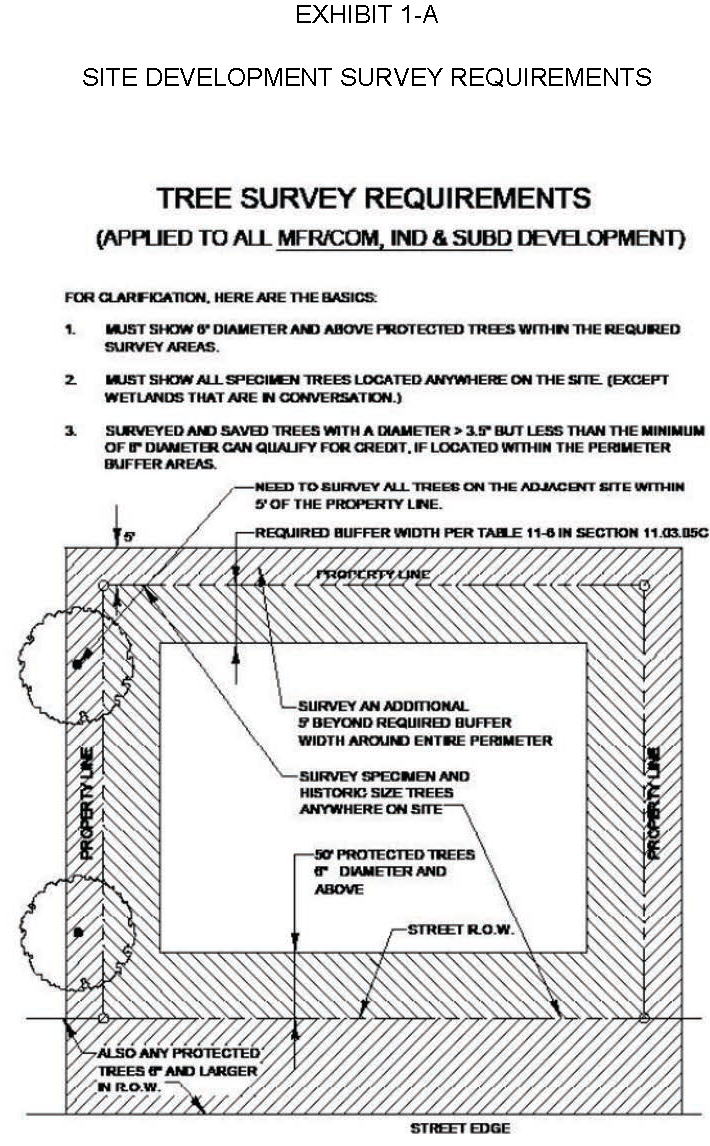 Tree survey: A survey prepared by a Florida licensed land surveyor showing, in addition to all information required by Rule 61G-176, F.A.C. the location, DBH, and common name of all qualifying protected trees within the area proposed for development. Non-protected trees may be designated as "clumps" with the general location and predominant type shown. (See Exhibits 1-A and 1-B)