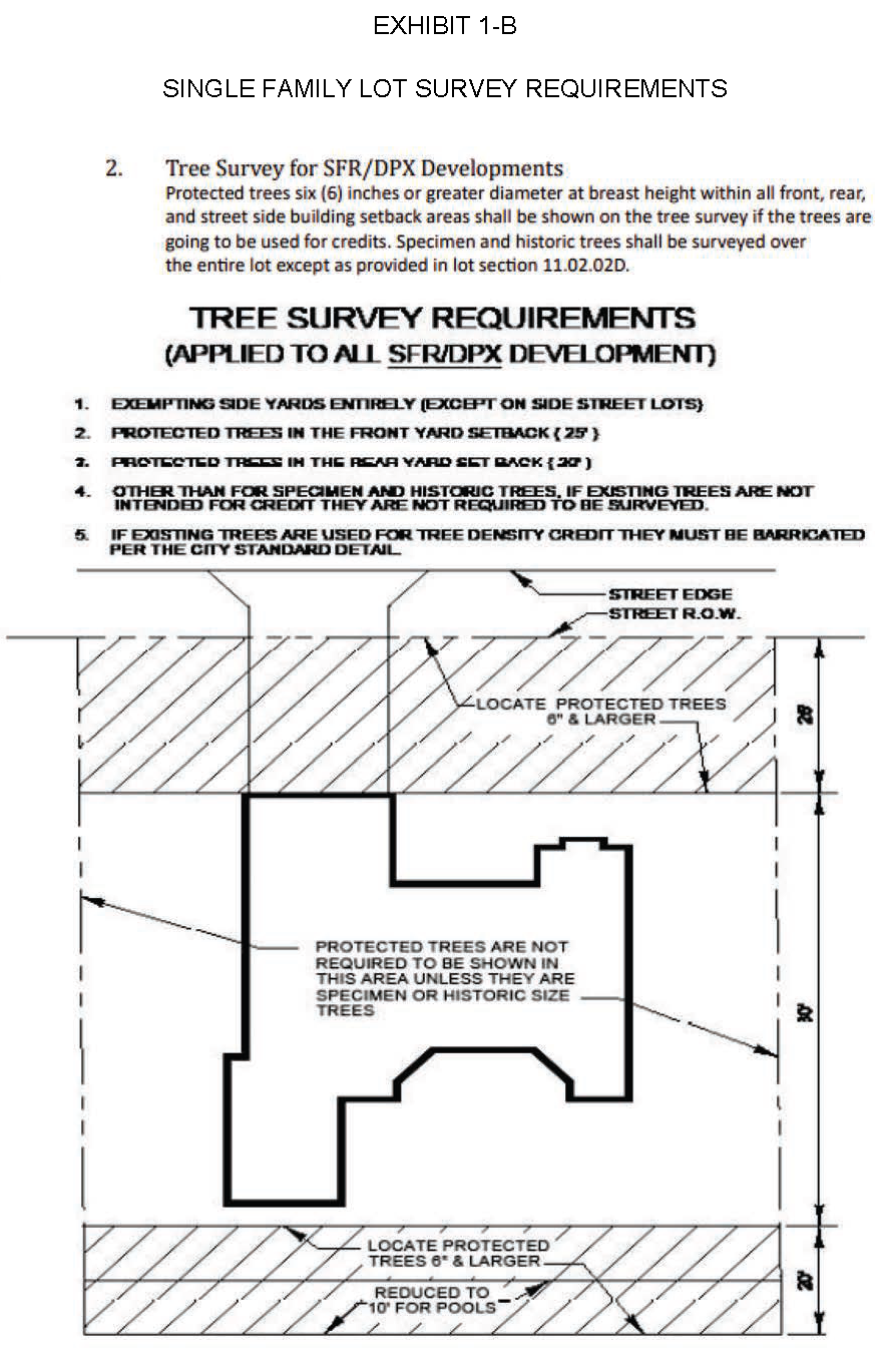 Single-family dwelling lots: Each single-family residential lot must preserve or replant at least fifty (50) percent of the total pre-development caliper inches existing on the site. Preserved protected trees may be substituted for tree planting required by the landscaping section of this Code. Trees located within or immediately adjacent to (within ten (10) feet of the foundation, or where the crown or rootball extend within the limits of the foundation, whichever is greater as to its encroachment) the building foundation are exempt.