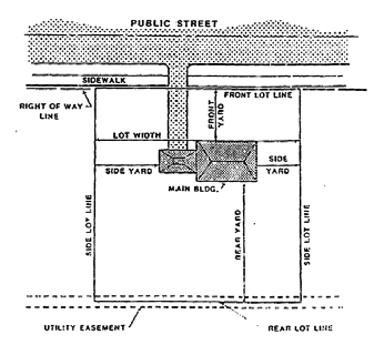 Setback required means the required minimum horizontal distance between a front, rear, or side lot line and a building line. Separate definitions for condominium projects are listed under "condominium setbacks."