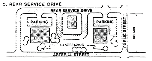 In cases where a site is adjacent to undeveloped property, the site should be designed to accommodate a future frontage road, parking lot connection or rear service drive.