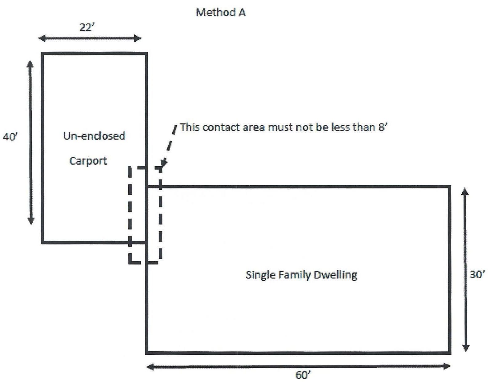 Twenty percent of the subordinate structure's abutting side must be in direct contact with the wall of the primary structure. (See illustration Method A.)
