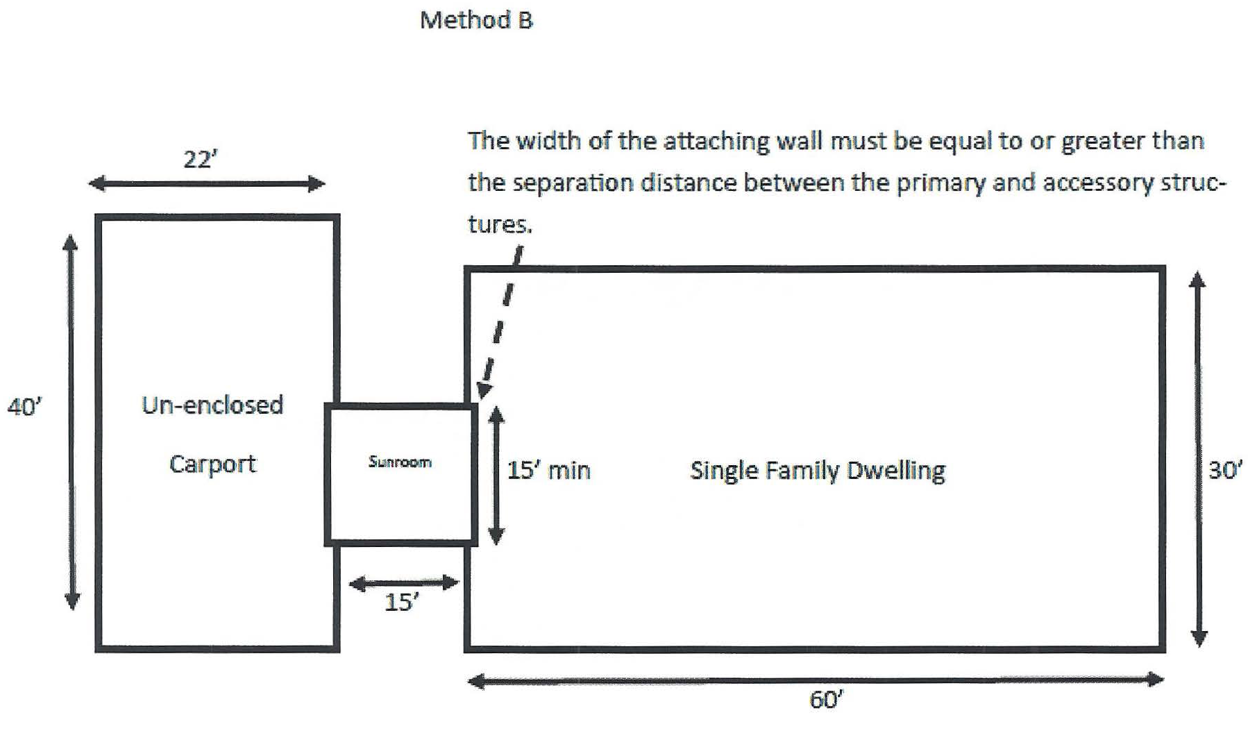Subordinate structures not in direct contact with the primary structure shall be attached by structures which are enclosed not less than 75 percent, such as sun rooms. The width of the adjoining attachment shall be equal to, or greater than, the horizontal distance between the primary and subordinate structure. (See illustration Method B.)