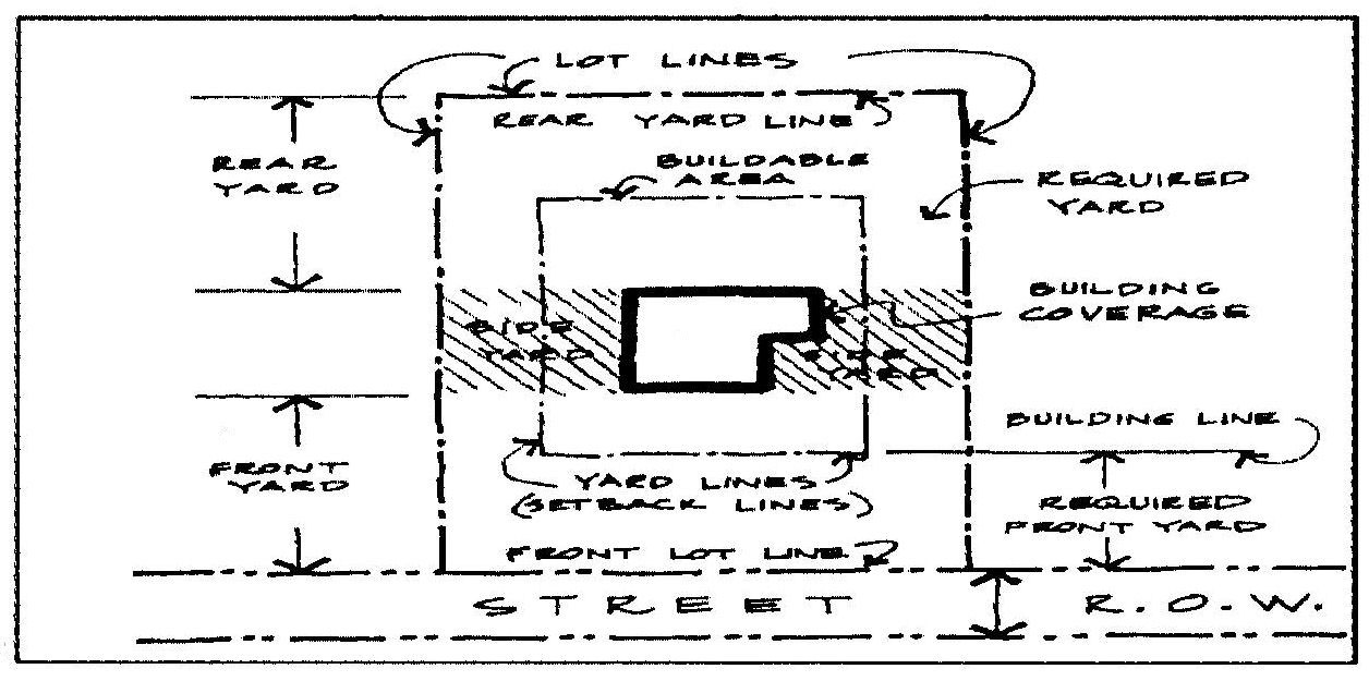 Yard, required. That part of a yard between a lot line and the minimum required building setback line, within which no structure shall be located except as provided by this chapter.