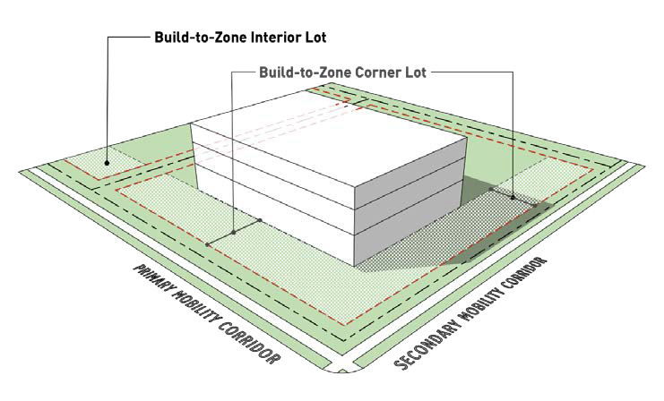Build-to zone. The area of a lot where a building facade must be placed.