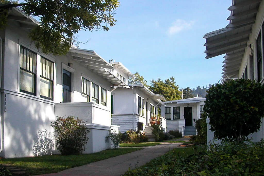 Cottage court. A group of small-scale detached dwellings arranged around a shared court visible from the road.