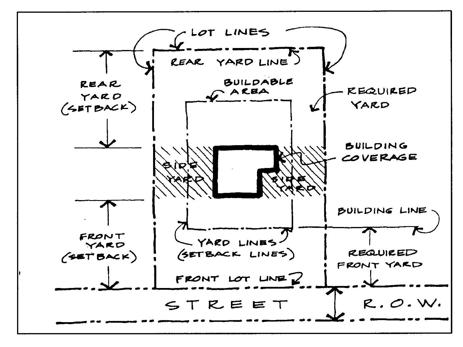 Yards, setbacks, buildable area. The required front, side, and rear yards for individual lots, as set forth for by Table III shall be measured inward toward the center of said lot from all points along the respective front, side, and rear property lines of the lot. Once the yard areas of a given lot have been established, the remaining area of the lot which is not included in any required front, side, or rear lot shall be known as the "buildable" area within which the approved structure(s) shall be placed.