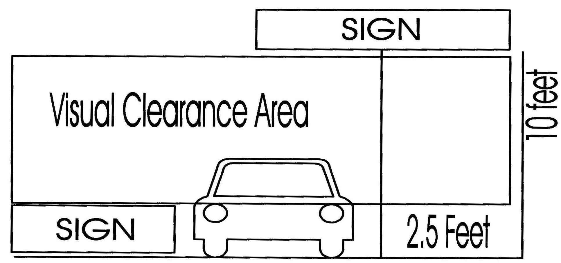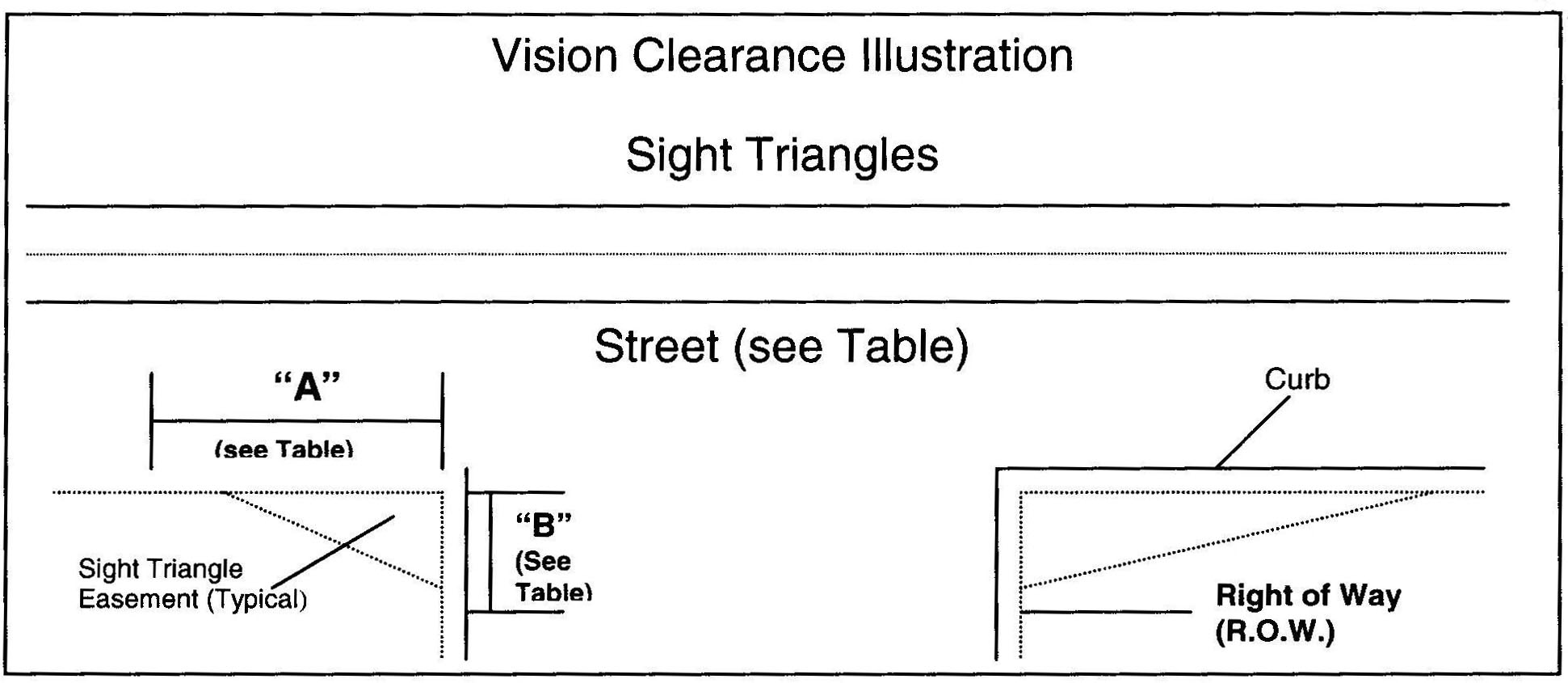On any corner lot in any district except the B-4, no planting shall be placed or maintained and no fence, building, wall, or other structure shall be constructed at any point between a height of two and a half feet and ten feet above the upper face of the nearest curb (or street center line if no curb exists) and within the triangular area bounded on two sides by the street right-of-way lines and on the third side by a straight line connecting points on the two street right-of-way lines as required by the site triangular and vertical vision clearance illustration. However, poles and support structures less than 12 inches in diameter may be permitted in such areas.