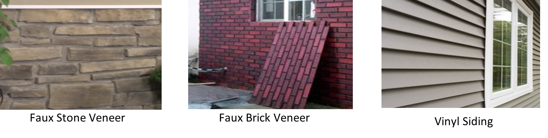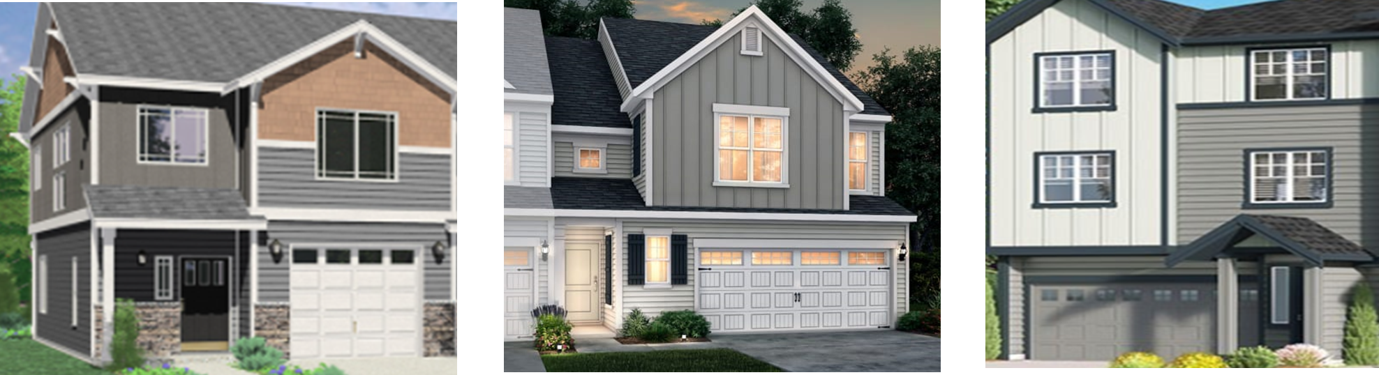 Brick or stone is only partially used or is not used at all as the required exterior finish, and carriage-style garage doors are not used. In addition, required elements over the projecting garages (left and middle examples) are missing.