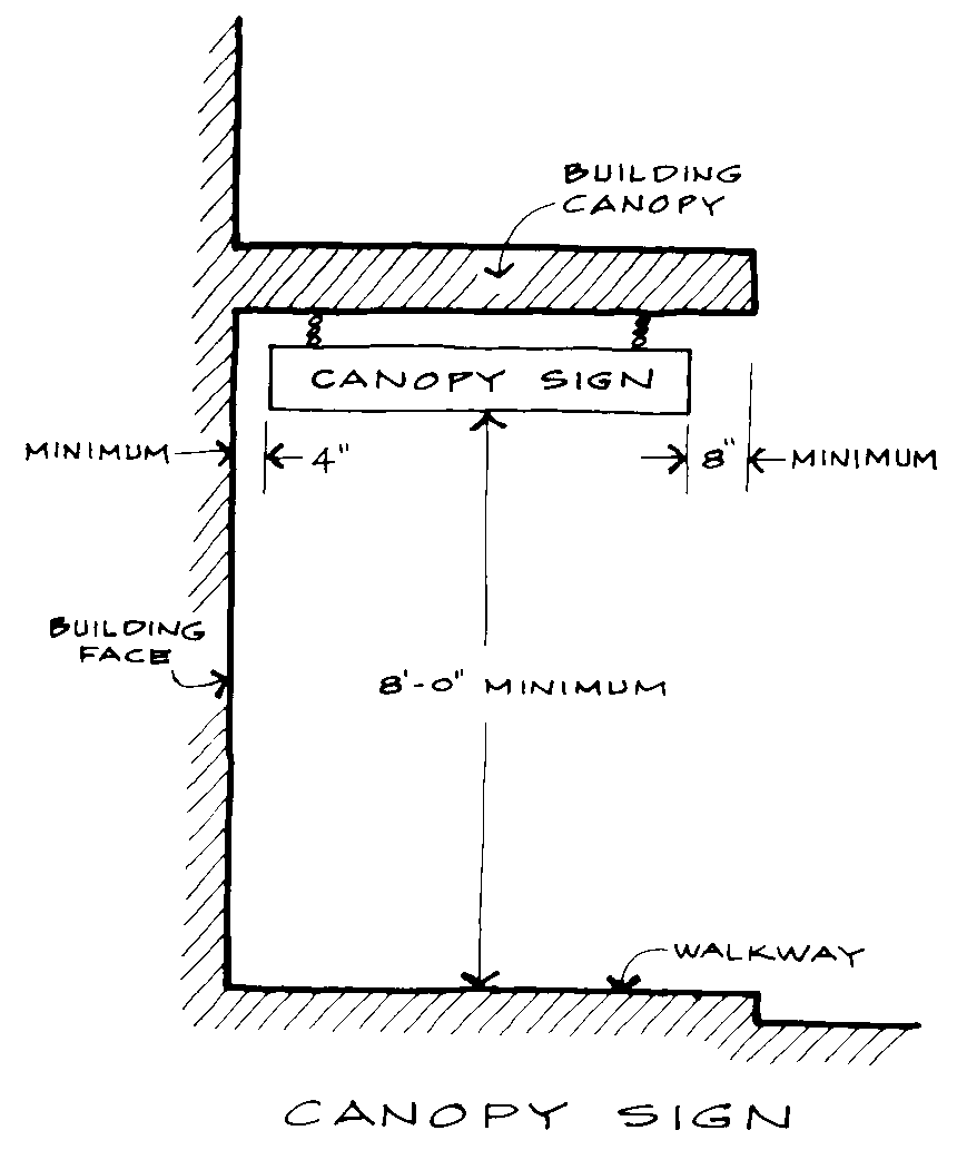 Over Private Property: Projecting, awning, and canopy signs shall provide at least 8 feet of clearance above the ground when erected over pedestrian walkways on private property and 17 feet of clearance when erected over driveways or other areas used for vehicles. Suspended canopy signs shall be at least 4 inches from the building face and at least 8 inches from the edge of the canopy.