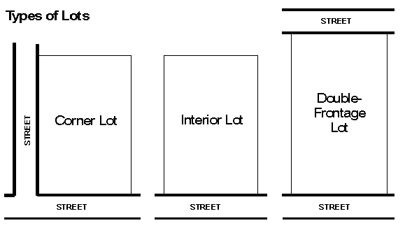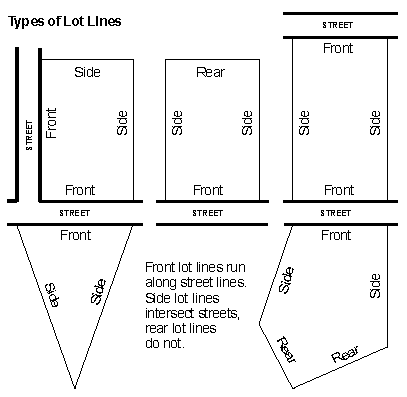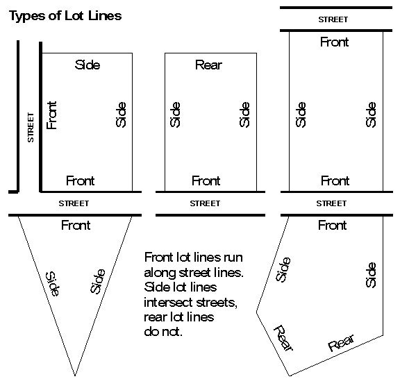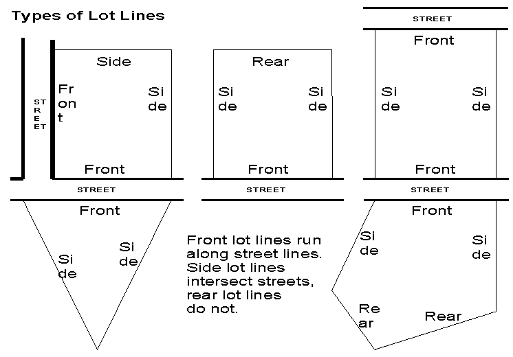 Building Tree Line: The lines extending from the corners nearest a street to the side lines of the lot (not including a street right-of-way), parallel to the right-of-way line or to the chord of that line.