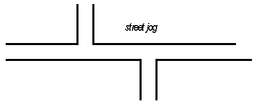 Street Jog: The incidence where two (2) streets or two (2) portions of a street are separated by a relatively short distance, usually at their intersection with another street. (See illustration below.)