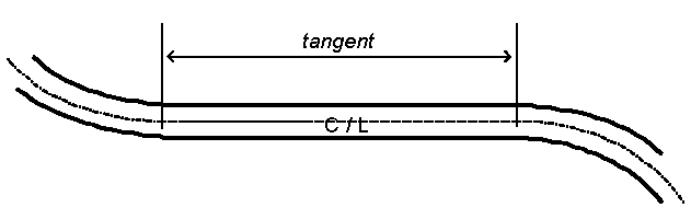 Tangent: The straight-line distance between the ending of one curve of a line (centerline of a street) and the beginning of another curve of the same line (centerline.) (See illustration below.)
