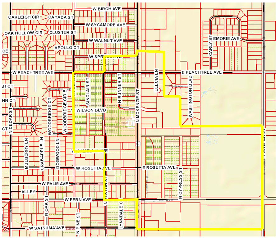 A map of the FDOD overlay boundary is included in the Zoning Ordinance (see Appendix Exhibit A), and a layer containing the FDOD boundary will be provided in the online Foley Zoning Map.