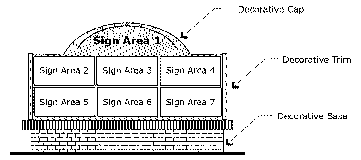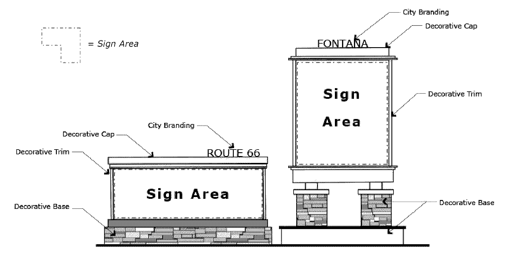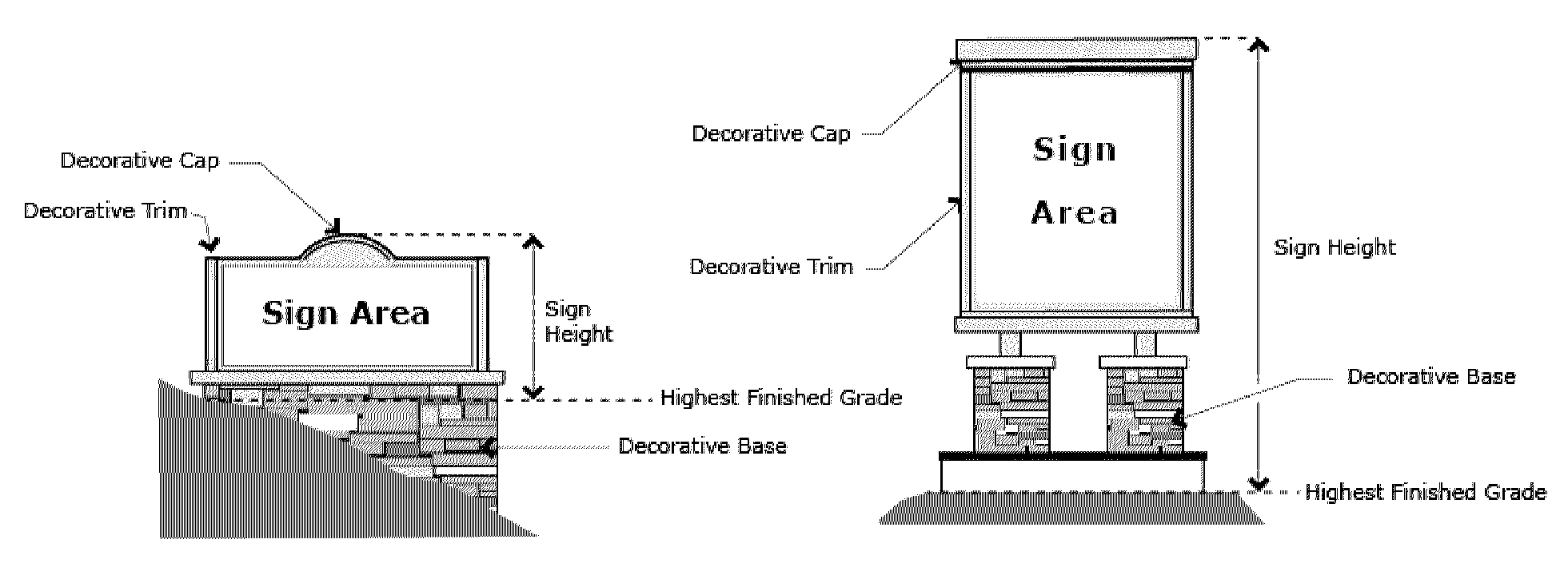 Monument sign means a freestanding ground sign with low overall height and the appearance of having a solid base. Moreover, a monument sign includes a decorative base, cap, and trim. See "freestanding sign."