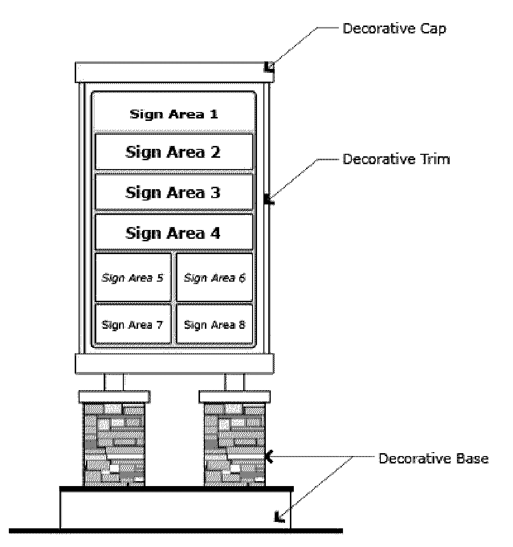 Pylon sign means a freestanding sign that is supported and in direct contact with the ground or one or more solid, monumental structures or pylons and which typically has a sign face with a vertical dimension that is greater than its horizontal dimension. Moreover, a pylon sign includes a decorative base, cap, and trim. See "freestanding sign."