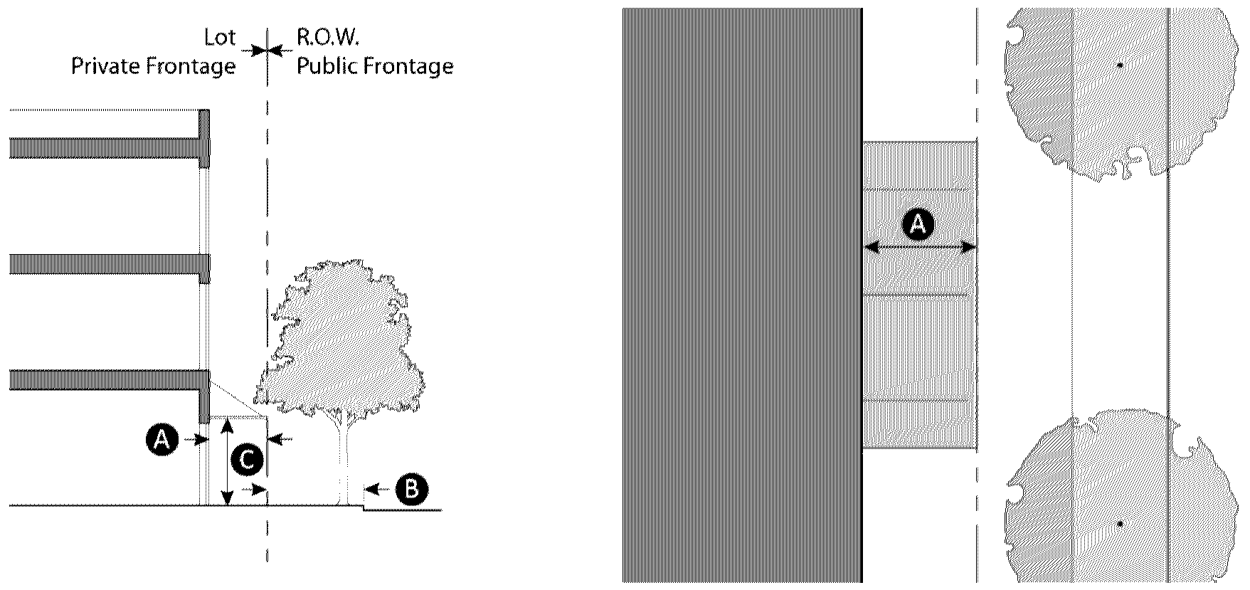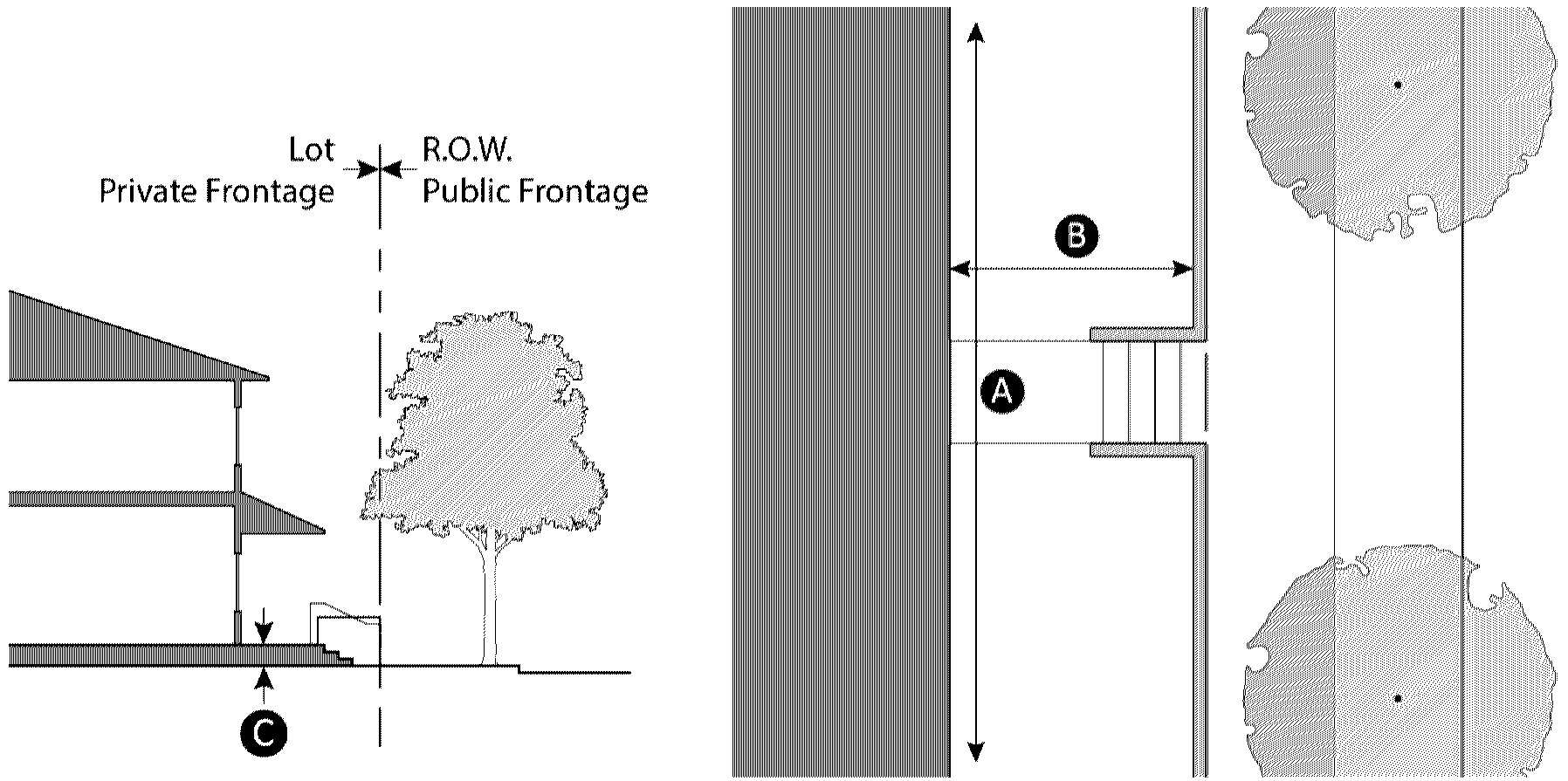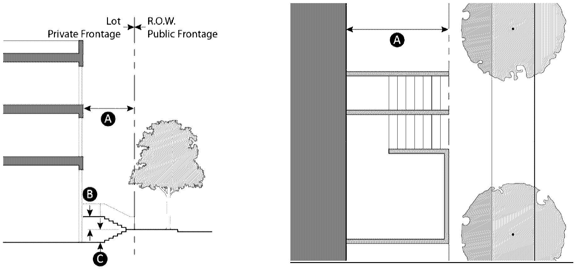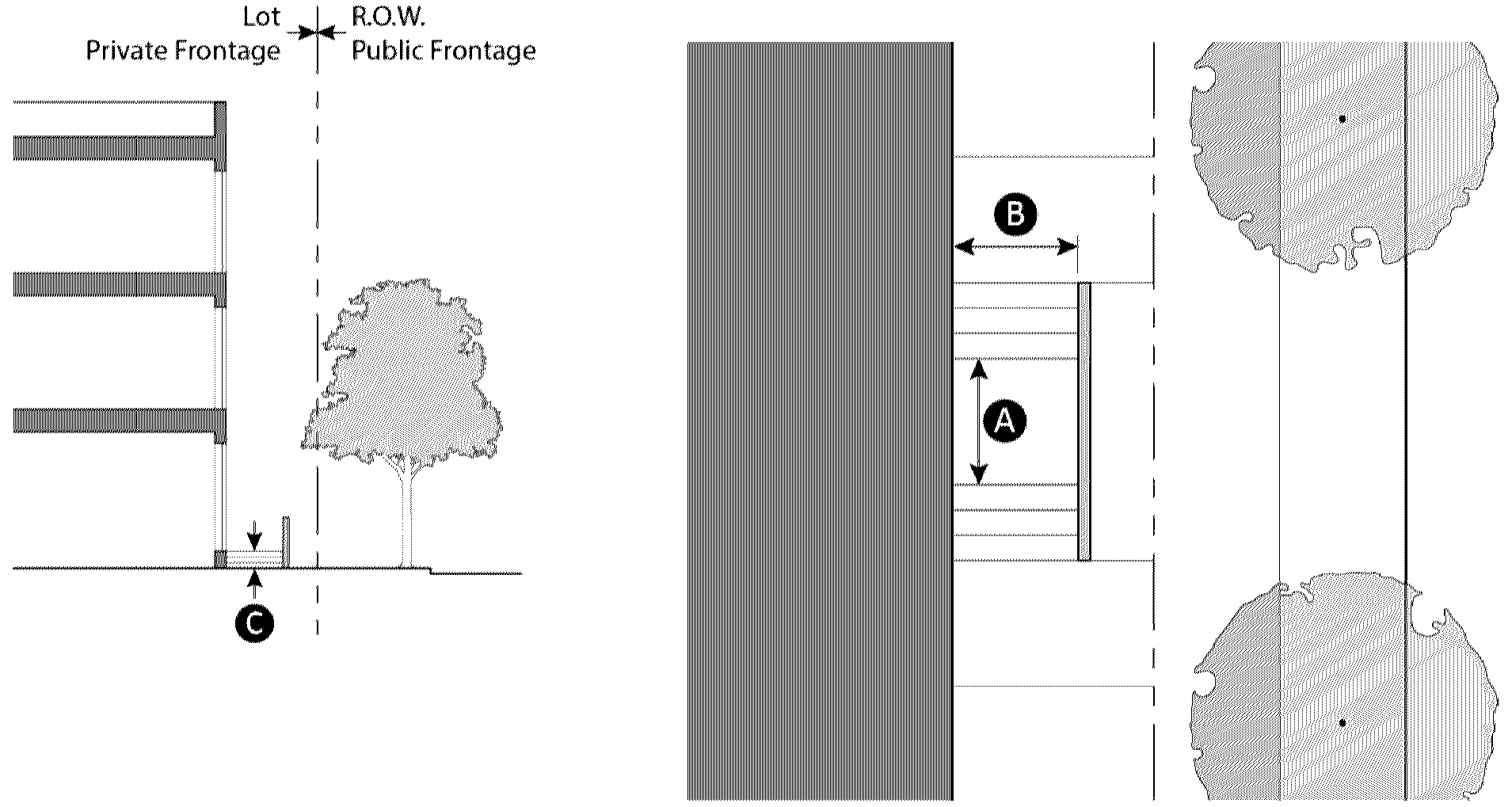 Definition: A patio, terrace, or other platform extending from or adjacent to a building at the ground floor which is accessed by secondary unit entrances(s).