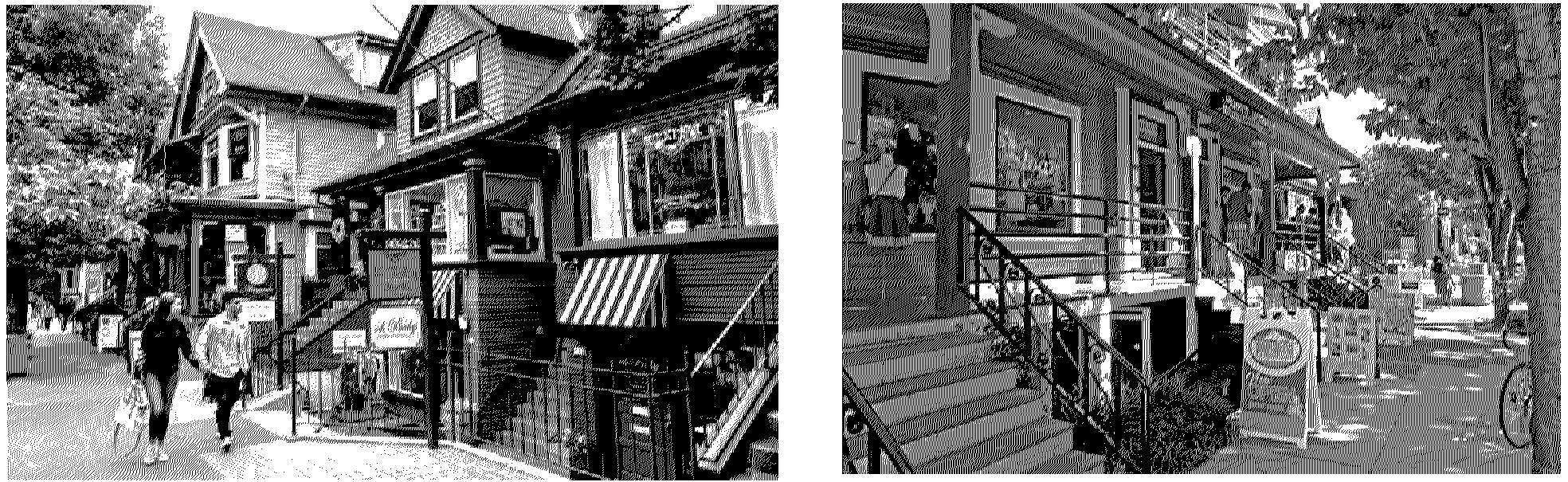 The front entrance to upper story uses is distinct from the storefronts and is attractively details to be recognizable as not a storefront component.