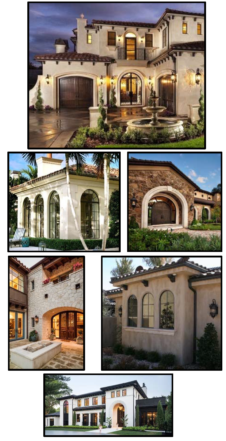 Dark painted or stained wood and dark metal (wrought iron) are used as trim and ornamental elements in Mission and Spanish styles, while light or colored trim may also be used in Mediterranean styles.