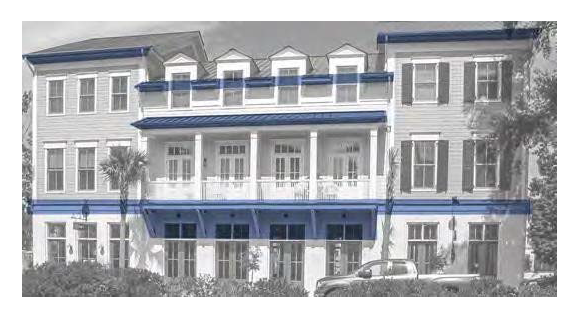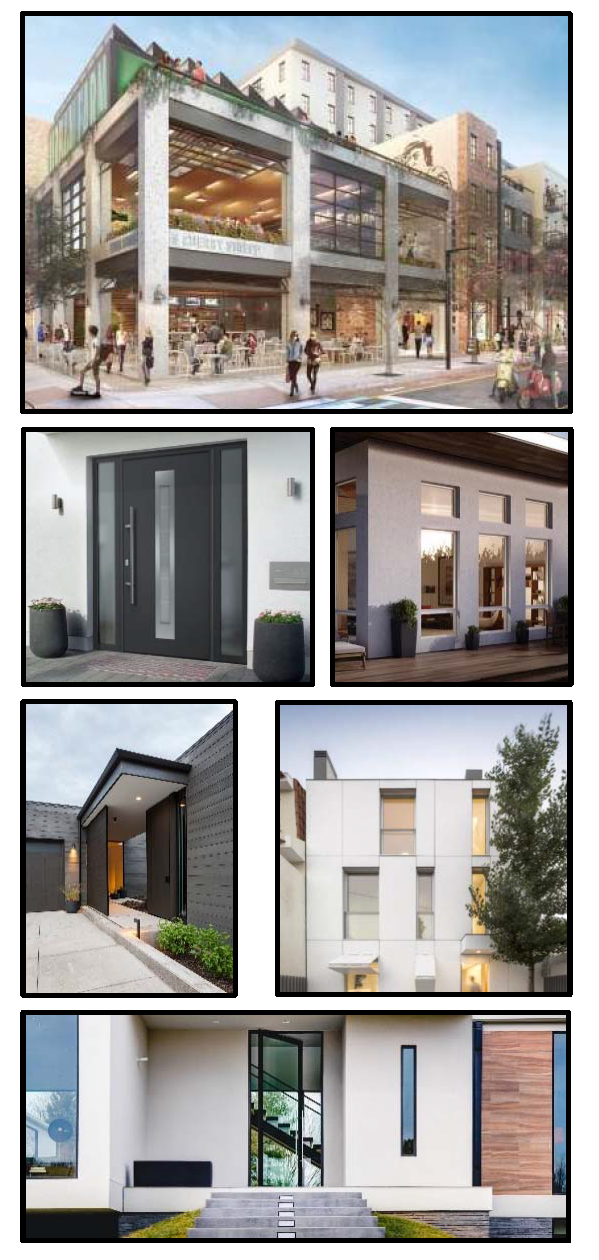 Storefront designs like those used within the Early 20th Century Commercial Style can occur within storefront openings on facades. Storefront materials and colors such as ceramic tile, dark painted woods, and dark metals are selected in coordination with overall building colors.