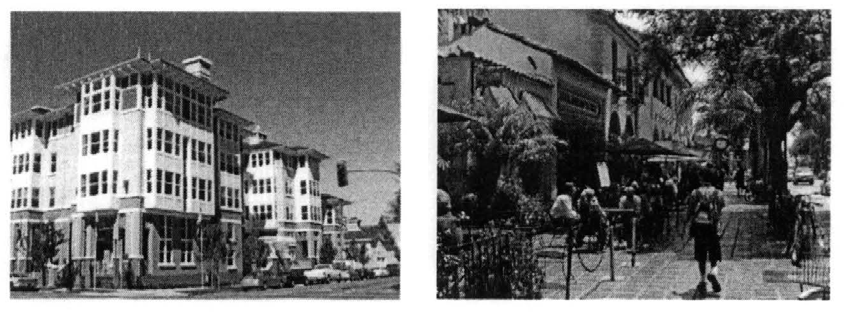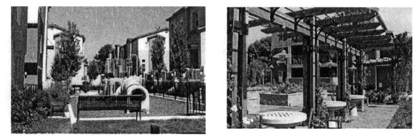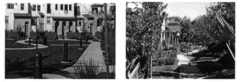 Walkways between dwellings in a multifamily project shall be expanded in select locations to provide for occasional sitting areas.