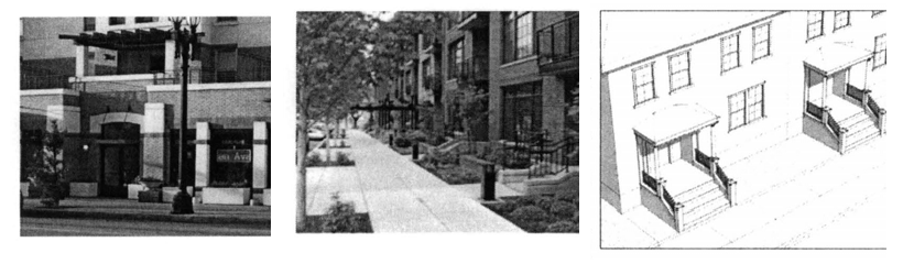 Townhouses and cluster housing projects are required to have entry drives. These shall be long enough to provide a definite sense of arrival at the entry of the residential community. Sidewalks shall be provided on at least one side of the entry drive.