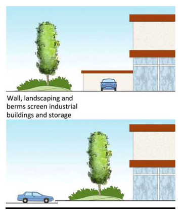 Yards abutting residential districts. A minimum ten-foot wide landscaped strip shall be provided as a buffer along all yard areas abutting a residential district. This area shall contain a minimum of one tree for each 25 linear feet of lot line and three shrubs for each tree. A combination of trees and shrubs shall provide appropriate screening as approved by the Director of Community Development on a case-by-case basis.