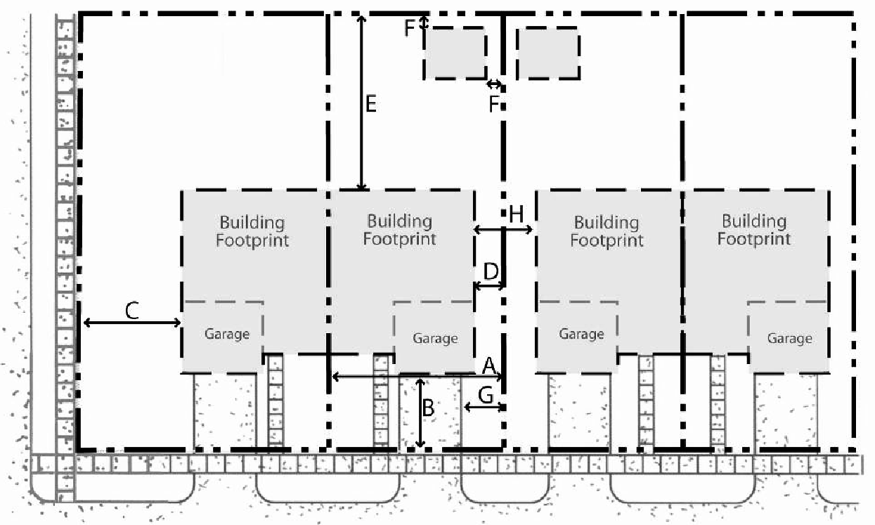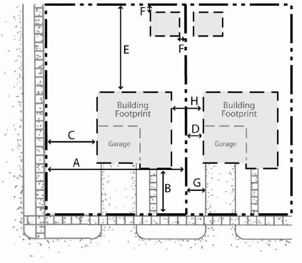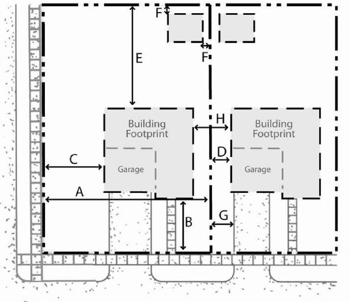 This following figure is intended to provide a sample graphic representation of setback and dimensional requirements for twin-house land uses. Specific requirements are listed in article II under the density, intensity and bulk requirements for each zoning district.
