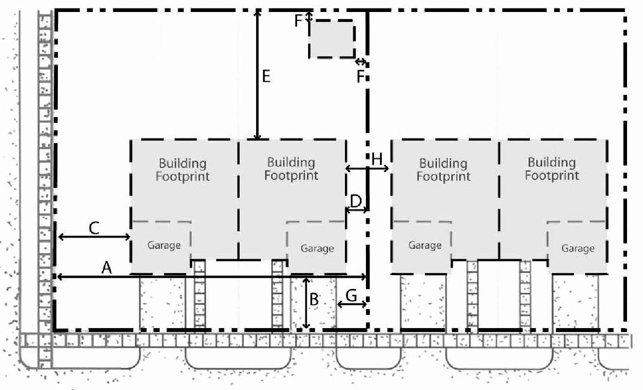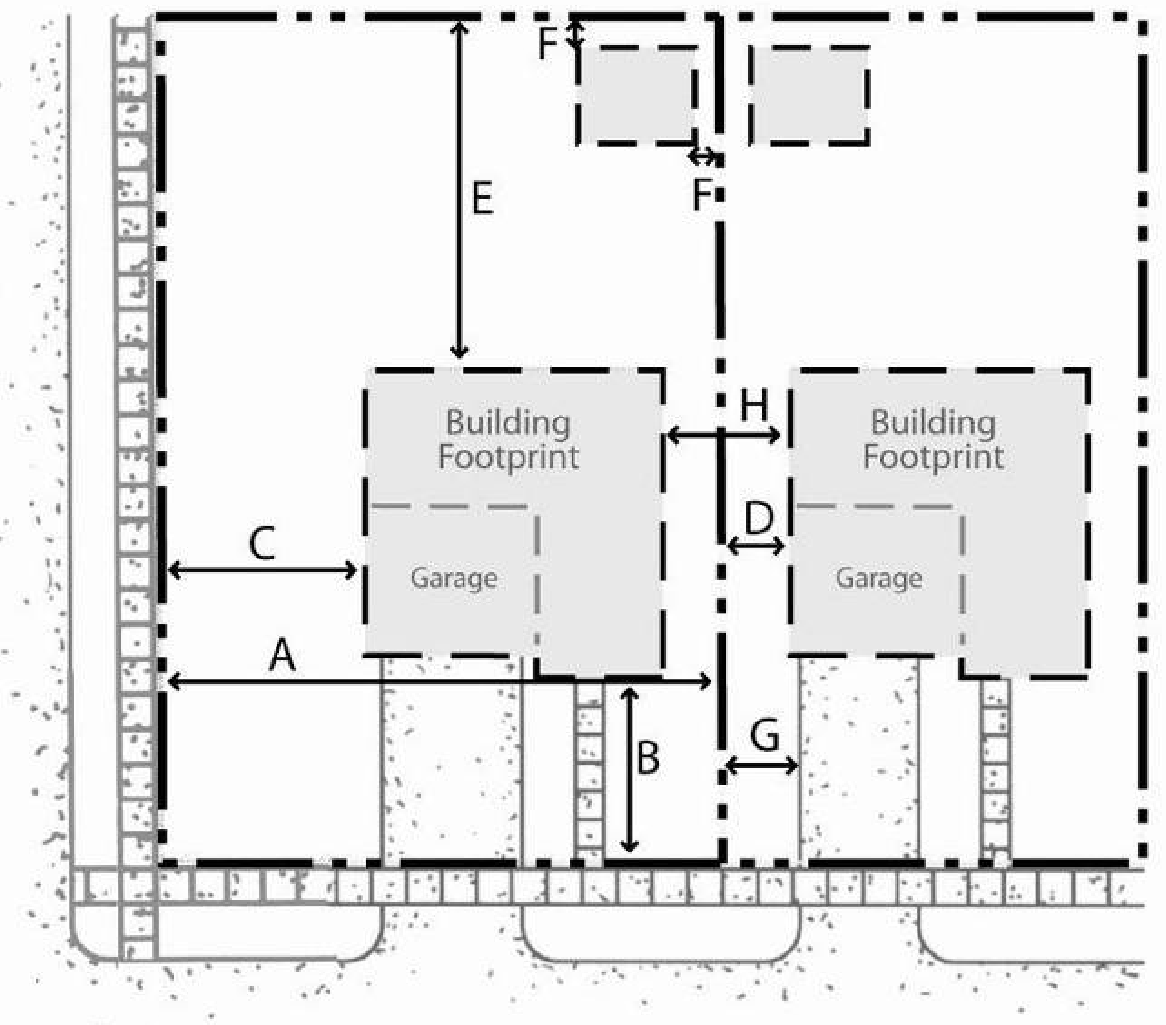 This following figure is intended to provide a sample graphic representation of setback and dimensional requirements for duplex land uses. Specific requirements are listed in article II under the density, intensity and bulk requirements for each zoning district.