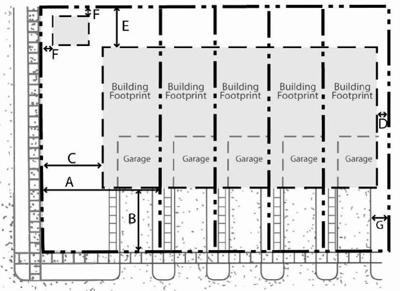 This following figure is intended to provide a sample graphic representation of setback and dimensional requirements for townhouse land uses. Specific requirements are listed in article II under the density, intensity and bulk requirements for each zoning district.