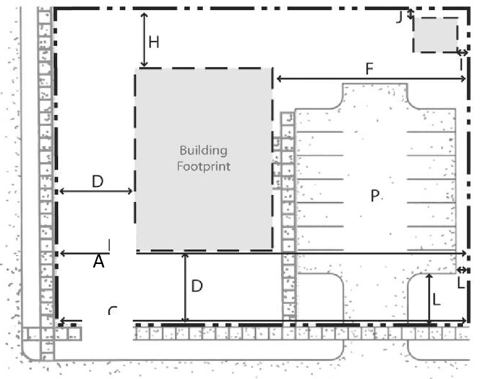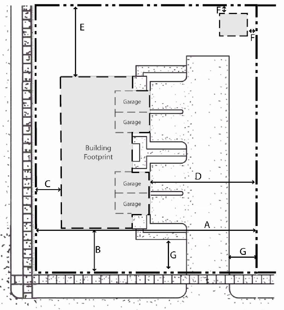 This following figure is intended to provide a sample graphic representation of setback and dimensional requirements for multiplex land uses. Specific requirements are listed in article II under the density, intensity and bulk requirements for each zoning district.