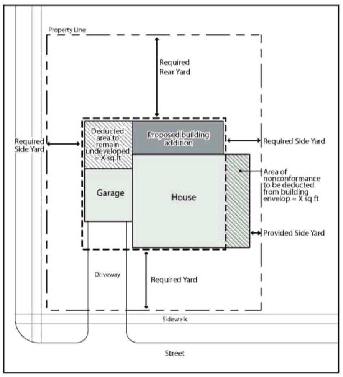 The total square footage of existing nonconformance of a structure (those portions of the existing structure currently and proposed to remain in the required setback areas, including all floor areas) shall be deducted from the conforming building envelope and remain undeveloped. For example, 300 square feet of a first floor and 100 square feet of a second floor existing and remaining in the required setback area shall require a total of 400 square feet within the building envelope to remain undeveloped by any proposed addition or enlargement. See also example in Figure 18-92 at the end of this section.