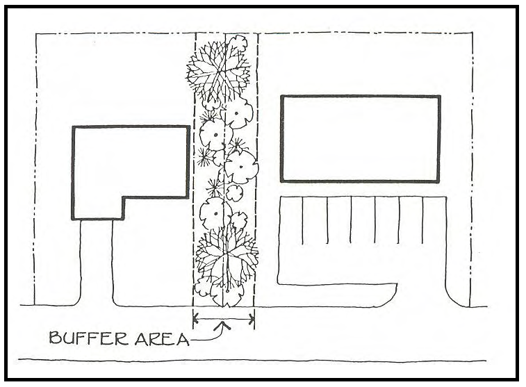 Screening. A fence, wall, hedge, landscaping, earth berm, buffer area or any combination of these provided to create a visual and/or physical separation between certain land uses. Screening may be located on the property line or elsewhere on the site.