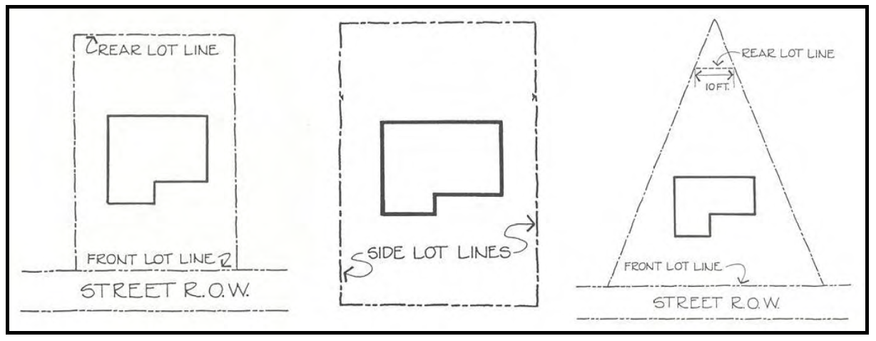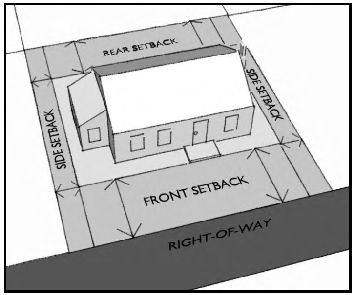 Setback, Rear. The required distance from the rear property line to a structure or parking area. Driveways may be located in this area unless otherwise specified by this Ordinance.