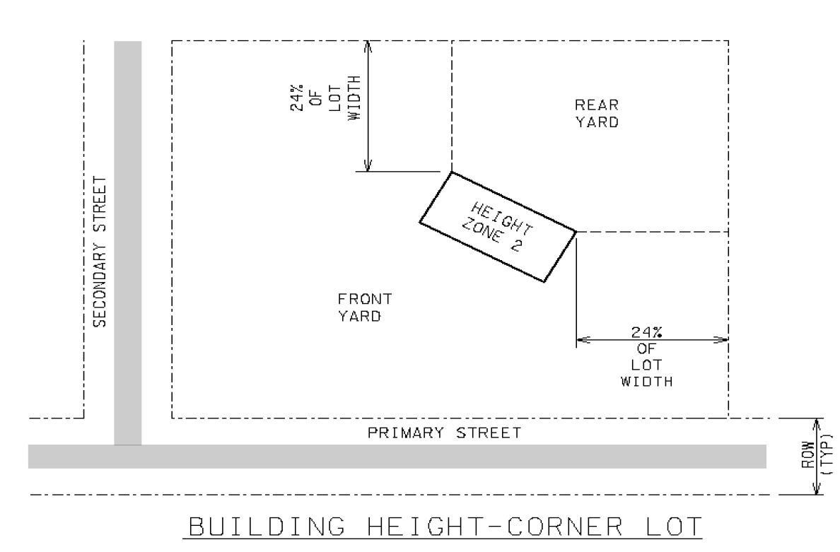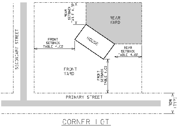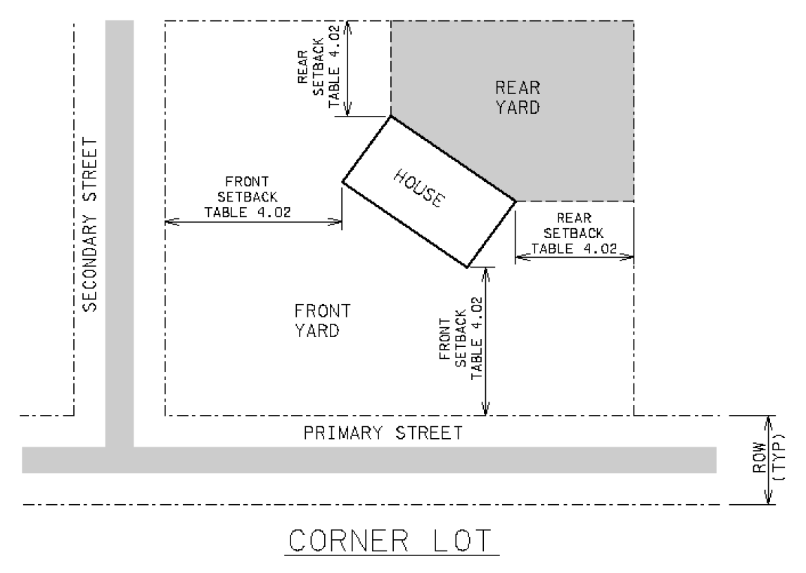 Lot(s), Corner: A Lot situated at the junction of two or more streets that extend the full length of the Lot facing each street. Both Yards between the street Right-of-Way and building shall be considered Front Yards, which is defined and illustrated below.