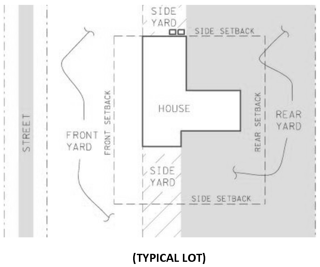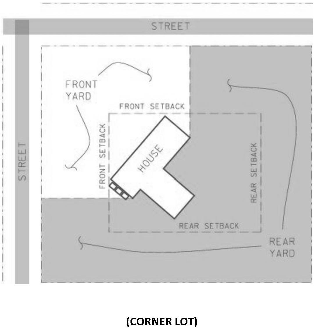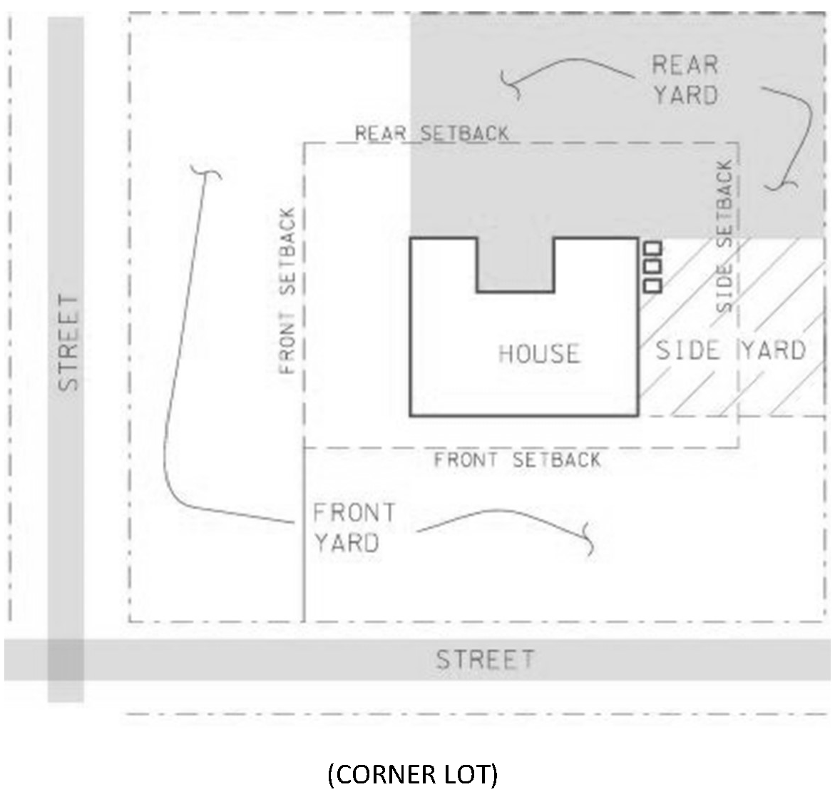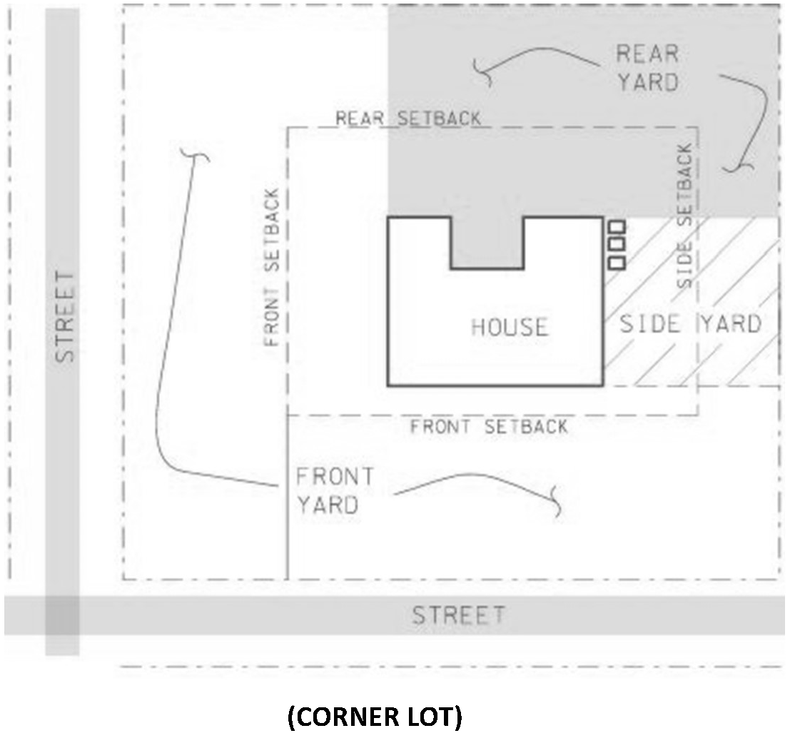 Yard(s): The area of any lot, including the front, side, or rear yards, where construction of buildings or any structures is restricted by the Zoning Ordinance. The location of the Front Yard, the Side Yard and the Rear Yard upon a Lot are as depicted in the illustrations below.