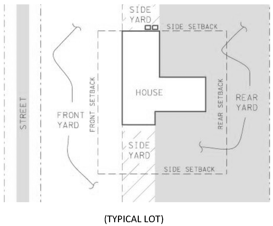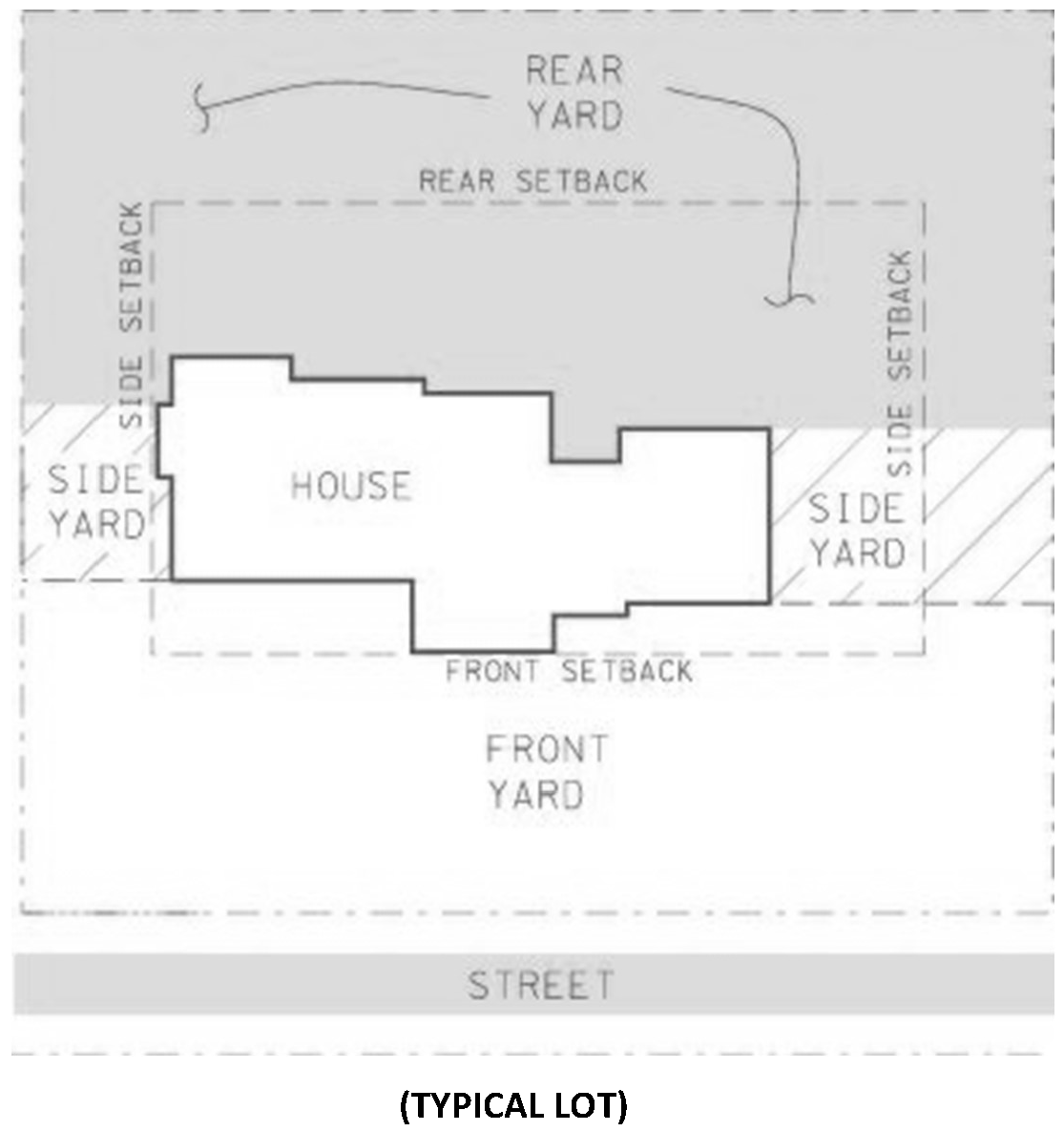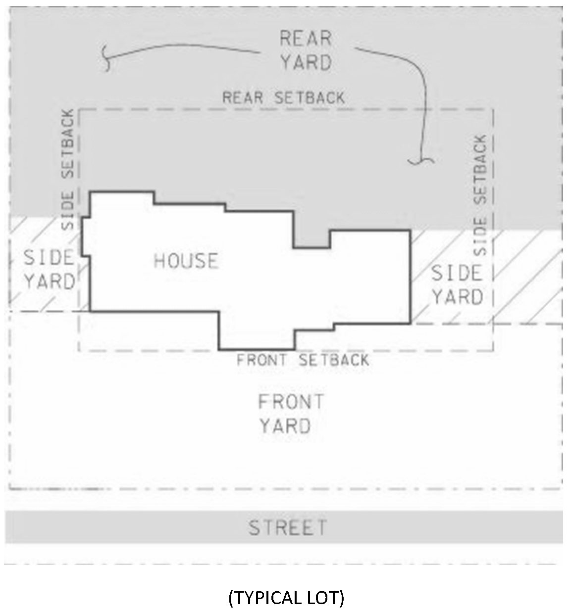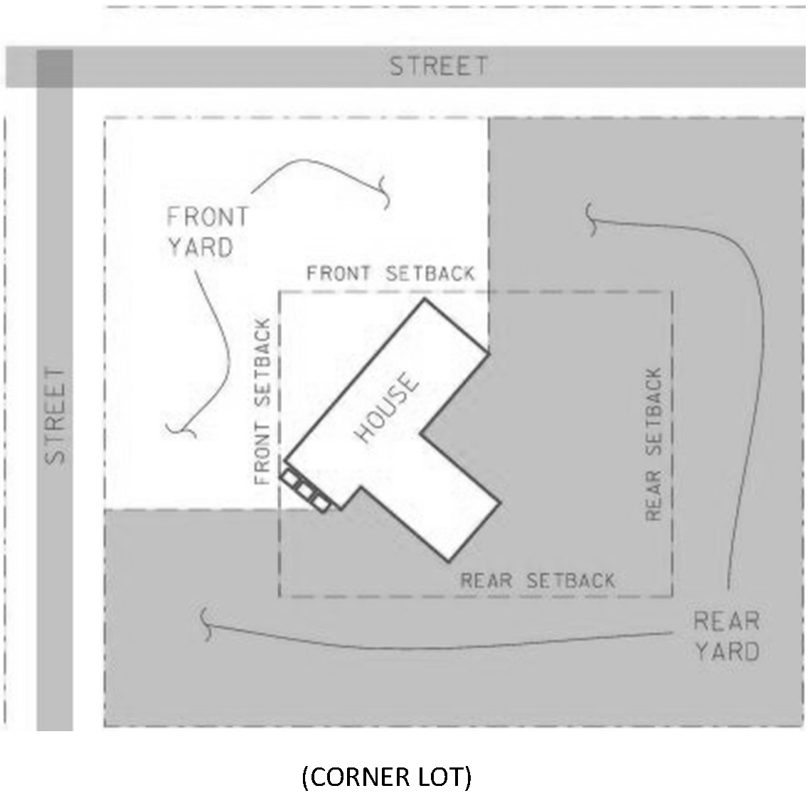 Yard(s): The area of any lot, including the front, side, or rear yards, where construction of buildings or any structures is restricted by the Zoning Ordinance. The location of the Front Yard, the Side Yard and the Rear Yard upon a Lot are as depicted in the illustrations below.