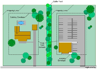 Buffer yards means an area adjacent to front, side and rear property lines, measured perpendicularly from adjacent property lines and/or right-of-way lines, intended to provide attractive spaces to reduce the impacts of proposed uses on adjacent property or natural features and to screen incompatible uses from each other. Buffers also help to maintain existing trees or natural vegetation, to block or reduce noise, glare, or other emissions and to maintain privacy. Buffer yards are in addition to, but separate from, the front, rear, or side yard setbacks.